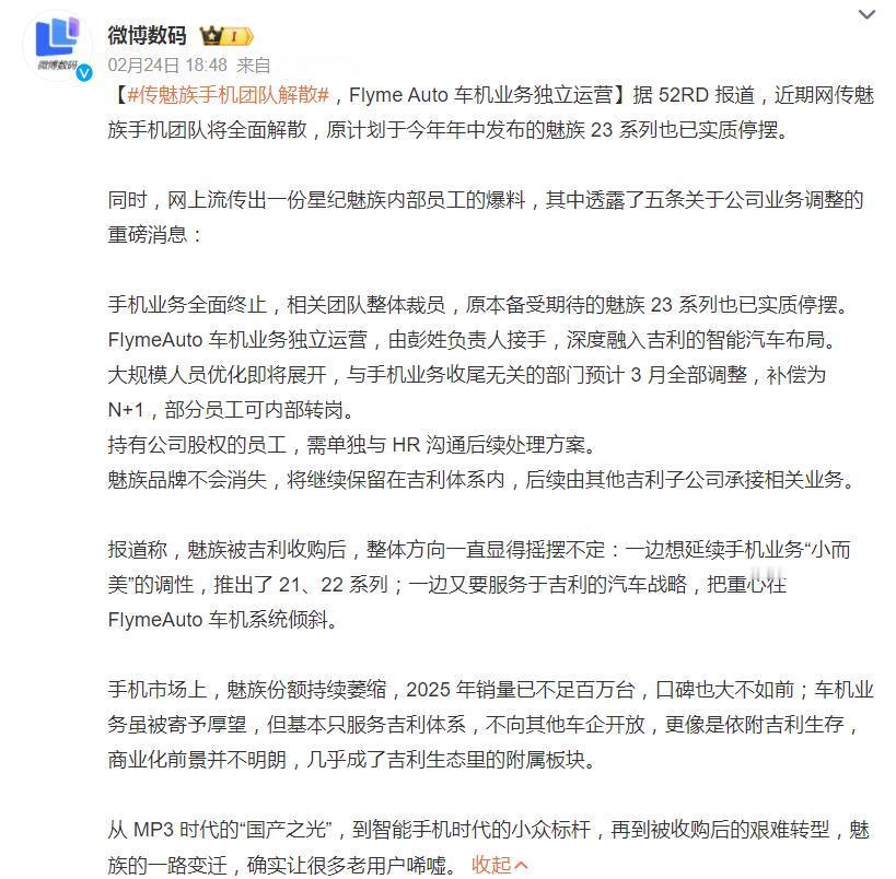 魅族手机成绝唱?情怀终究败给现实…… 据官方机构账号微博数码援引52RD 报道,近期网传魅族手机团队将全面解散,原计划于今年年中发布的魅族 23 系列也已实质停摆。 大家都说说看,有没有用过魅族的MP3或手机、耳机等产品?小编印象中,魅族是一家有品味、有情怀的民营企业,曾有过辉煌,高管“三剑客”一度成为坊间美谈…… 希望传闻是假的,官方赶紧回应吧!