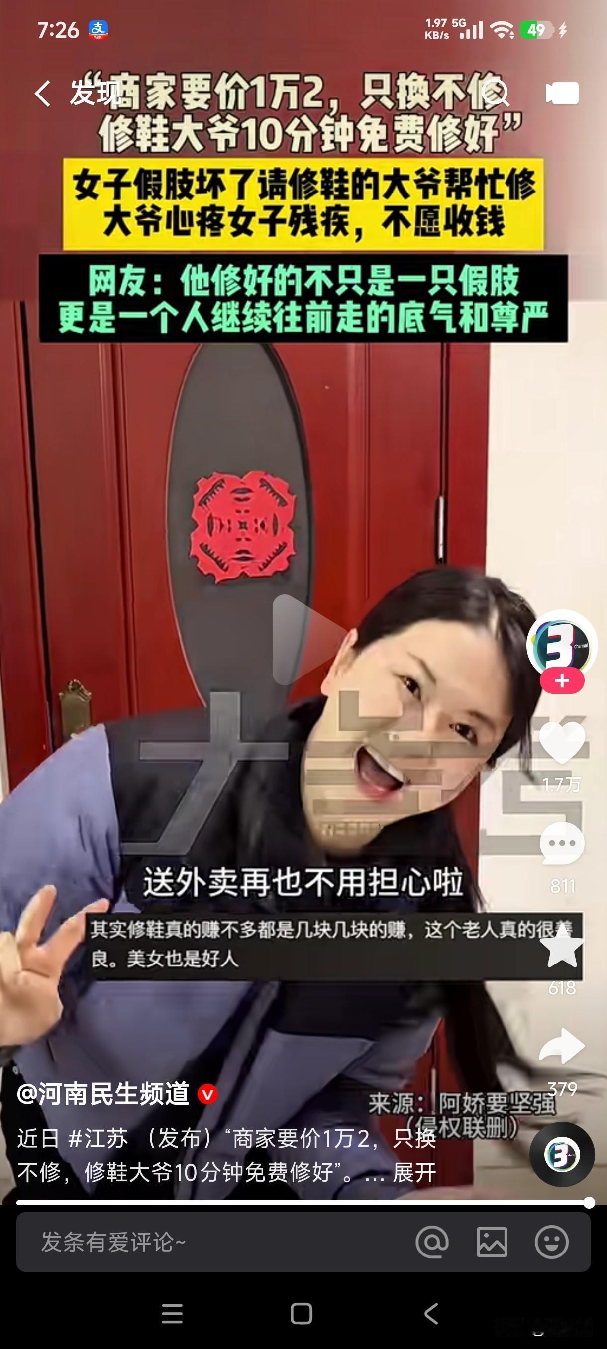 女子假肢坏了找商家帮忙修复,居然要价1万2只换不修,无奈之下只好放弃,谁能想到修鞋大爷10分钟免费帮女子修好。 修鞋大爷修了一辈子的鞋,没想到有一天居然把假肢也能修好,女子面对商家的高额要价换修费无力支付时,她竟然抱着试试的心态去找修鞋大爷,问问看大爷能不能帮忙修一下假肢,没想到大爷听到女子询问能不能修假肢时,大爷也当场愣住了,原来女子是一个残疾人,立即说到可以帮忙修。 不一会的功夫大爷就给女子修好了假肢,女子给大爷钱时大爷坚决不愿收,女子对大爷说她挣钱比大爷容易,帮了这么大的忙不收钱她心里过意不去,但是大爷无论如何都没有收她的钱,最后女子买了水果送给大爷,对大爷的免费帮助女子也甚是感谢,女子回家穿上假肢,一边拍视频一边高兴的说,假肢终于好了,既能蹦又能跳的,送外卖再也不用担心了。 大爷修好的不仅是一个假肢,更是一个残疾人努力向前走的底气和尊严,彼此都是为了生活,也许最底层的人更能体会到相互之间的不易!