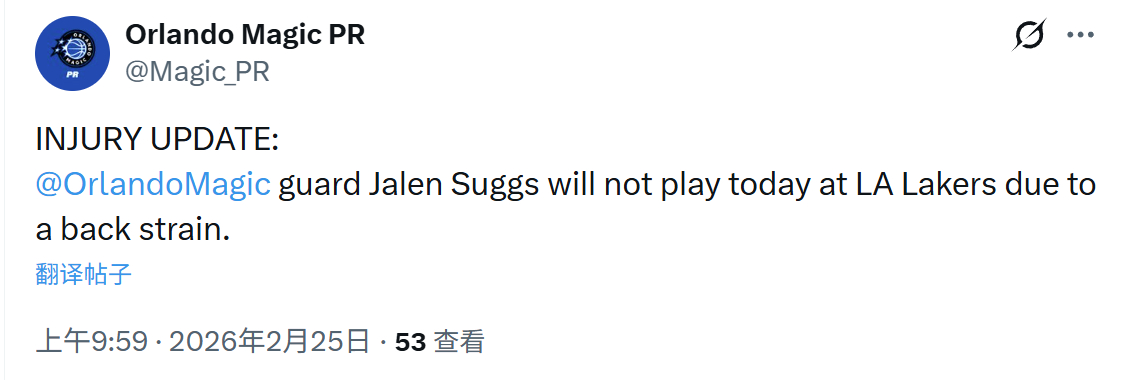 华佗队无能为力魔术后卫萨格斯将连续缺席第三场比赛,背部拉伤。