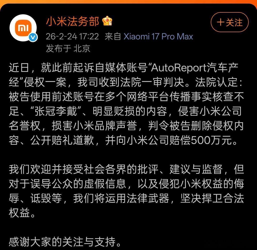 两个官司,一个赔偿30万,一个赔偿500万。也提醒了广大内容创作者,内容要吸引观众没错,但不要触碰法律底线。 小米起诉自媒体获赔500万