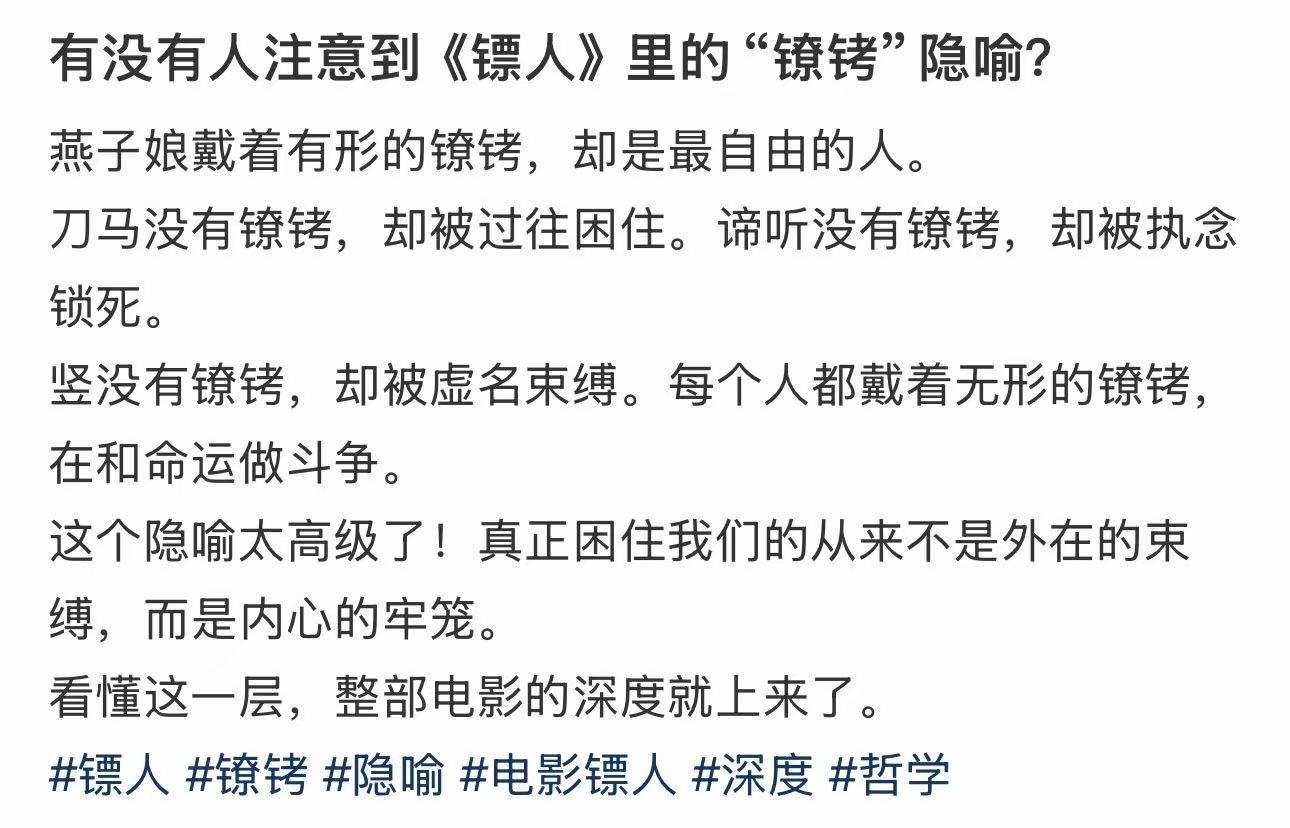 镖人的思想还是太超前了刀马看似洒脱,却从没走出过去,嘴上追自由,不过是换枷锁。最终挣脱自我束缚重回长安,这是普通人最勇敢的微小反抗!