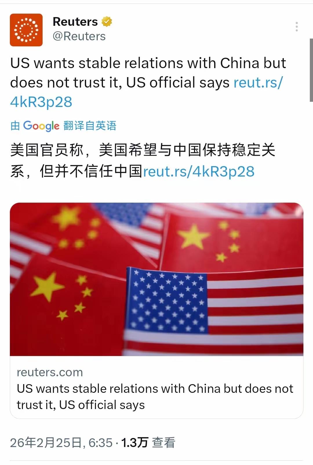 路透社今天(2月25日)报道:“美国官员称,美国希望与中国保持稳定关系,但并不信任中国。” 路透社说的这位美国官员是美国国务院负责经济事务的副国务卿雅各布·赫尔伯格,他是在周二(昨天)的国会听证会上做出上述表示的。 这里,雅各布·赫尔伯格说的“美国希望与中国保持稳定关系”中的“稳定关系”是什么关系?尽人皆知,他希望的“稳定关系”是指无论美国对中国做出什么出格的事、 特朗普如何出尔反尔,中国都不得反对,更不能反击,都得接受,并视其为理所应当。 但是,雅各布·赫尔伯格的这番指责,如果说是对颠三倒四、出尔反尔,极不稳定、不可信任的特朗普的反讽更恰当。