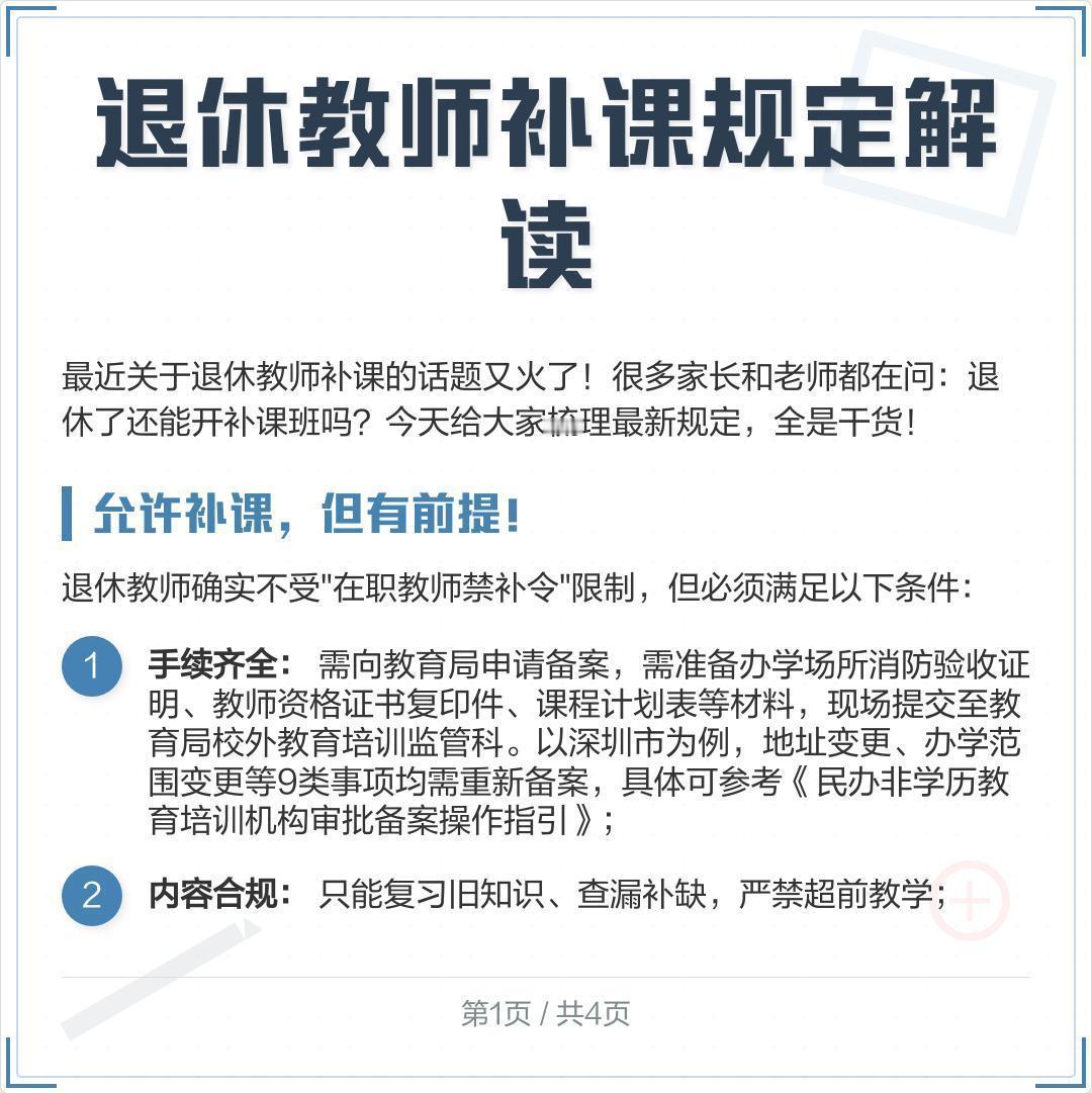 退休教师补课违规吗? 我还真的去查了一下,没有找到官方规定! 只是看到这样的一个图片! 第一要有正规的手续,就是证件齐全! 第二要做到不了内容合规! 符合以上要求就可以了! 但是个人认为。退休了就该好好休息,既然是有那个精力就回家给自己的孙子孙女辅导吧,一辈子教书育人,够累的,余下的时光好好生活,体会一下生活的乐趣,如果有能力好好教育培养下一点吧!钱是赚不完的,没钱不行,但差不多比上不足比下有足矣! 人生的乐趣不仅仅在于赚多少钱,而是做自己喜欢的事,年轻的时候为了生计不得已而被选择,退下来了,不要被选择,要做自己喜欢的事!见自己喜欢的人!欣赏没见过的风景,穿自己喜欢的衣服,品自己没尝到的美食,看淡得失,不和别人也不和自己较劲!开开心心舒舒服服不好吗!