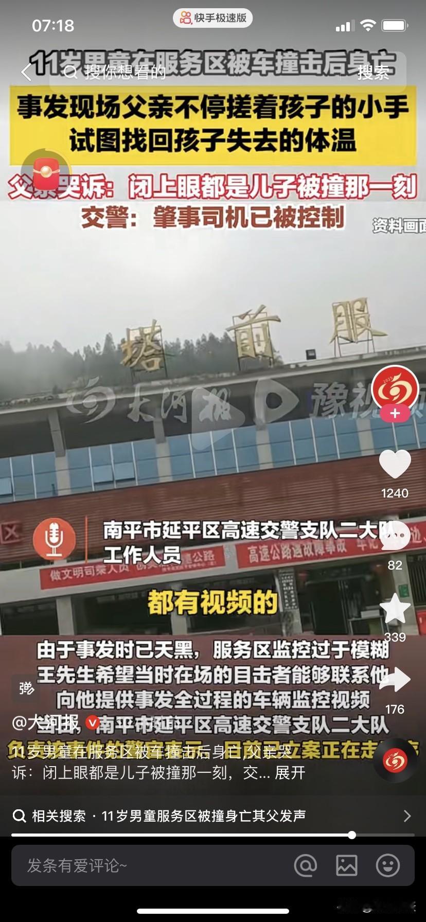 痛心,大年初六,11岁男童在服务区被撞身亡。 2026年2月22日晚上,福建省南平市延平区塔前服务区发生了一起交通事故。 王先生一家在服务区暂停时,王先生堂弟领着11岁孩子正上厕所,当堂弟领差孩子走向大厅外的斑马线时被一辆突然加速的私家车撞倒,11岁男童被撞当场身亡,堂弟被撞伤送医救治。王先生质问司机为什么开那么快?司机回答说:当时慌了。 现场看到,王先生正跪在儿子的身旁号啕大哭,他紧拽着儿子的小手不停地揉搓,试图想找回孩子刚刚失去的体温。可想而知,这位爸爸领着孩子出来旅游却没能安全的领回孩子,他怎么向爷爷奶奶交代?他心里该有多么自责崩溃? 这起交通事故带给人们的教训是:带着孩多还是尽量避开那些喧闹的地方,人满为患呀。[祈祷][祈祷]为了他人的安全,司机在人员密集的地方,一定要减速慢行。