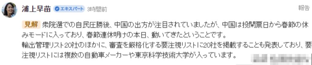 2 月 24 日,日本记者浦上早苗针对中国将 20 家日本企业列入管制清单一事,说出了一段颇为清醒的话:“自从高市早苗在众议院获得大胜后,日本一直在等待中国的反应,现在这只靴子终于落地了。中国此前之所以没有在第一时间反制日本,有两大原因,一是谋定而后动,二是中国正值春节假期,现在假期后上班的第一天,果然就采取了行动。中国除了把 20 家企业列入出口限制名单外,还把多家汽车制造商、东京大学等列入‘关注’名单。” 同样名为 “早苗”,浦上早苗的这番表态却十分透彻,而且保持了中立立场,没有明显倾向性,完全符合专业媒体人的素养。 2 月 9 日日本众议院选举落下帷幕,高市早苗带领自民党拿下 316 个席位,单独一党就超过众议院 2/3 的绝对多数,执政联盟更是斩获 352 席,这场 “闪电选举” 让她彻底巩固了执政根基。 她能顺利胜出,核心是精准抓住了日本社会的三重焦虑:对政局动荡的厌倦、对经济下滑的不满、对地缘安全的担忧,通过打造 “政治强人” 形象、承诺免税福利、渲染外部威胁这三套组合拳,成功笼络了民意。 但熟悉日本政治的人都清楚,这场 “大胜” 的背后,其实是日本右翼思潮的抬头,以及对军事扩张的明确推动,高市政府一直试图给日本防务产业 “松绑”,甚至计划全面解禁防卫装备出口,这也是中国选择出手反制的关键背景。 中国这次的管制措施针对性到底有多强?咱们先看那份被直接列入出口管制名单的 20 家实体,几乎清一色是日本军工体系的核心力量。 三菱造船、三菱重工航空发动机等企业,常年承接日本自卫队的潜艇、战机、导弹订单,2023 年三菱重工单从政府拿到的军事订单就高达 1.68 万亿日元;川崎重工航空宇宙系统公司专攻军用运输机和火箭技术研发,富士通防卫与国家安全株式会社则聚焦军事通信和传感器领域,就连防卫大学和日本宇宙航空研究开发机构也在列 —— 前者是日本培养军事人才的核心基地,后者的航天技术随时能转化为军事用途。 商务部公告明确指出,对这些实体禁止出口一切两用物项,也就是既能民用又能军用的技术和产品,正在进行的合作必须立即停止,特殊情况申请出口需经最严格审查,本质就是切断它们借中国技术提升军事实力的渠道。 浦上早苗提到的 “关注名单”,里面的门道同样不简单。 斯巴鲁和日野汽车这两家车企的入选让不少人意外,但其实一点都不冤。 斯巴鲁的核心技术是水平对置发动机和全时四驱系统,这种技术不仅适用于民用汽车,稍加改造就能适配军用越野车和轻型装甲车辆,而且它在华深耕二十多年,供应链早已和中国企业深度绑定;日野作为丰田集团旗下的商用车巨头,专注重卡和客车制造,而重型卡车正是改装军用运输车辆、导弹发射车的基础平台,而且它还在布局新能源商用车,氢燃料电池技术一旦被用于军事,后果不堪设想。 至于东京大学被列入关注名单,并非空穴来风,这家日本顶尖学府早在 2025 年就和台积电成立联合半导体实验室,研究的先进半导体技术属于典型的两用技术,既可以用于手机芯片,也能用于雷达、导弹制导系统,中国对其加强审查,正是为了防范敏感技术被转作军事用途。 所以说,浦上早苗说的 “谋定而后动” 确实说到了点子上。 首先,春节假期是客观因素,中国不会因为外交博弈打乱国内重要节日的节奏,节后第一个工作日就发布公告,既体现了效率,也表明了重视程度。 而且这更是对日本此前一系列动作的对等回应。 从 2023 年开始,日本就收紧了高端半导体制造设备的对华出口限制,2025 年引入 “最终用户清单”,到 2026 年 2 月更是大规模扩容,把 42 家中国实体列入清单,受其管制的中国企业已经达到 110 家,主要集中在半导体、人工智能这些关键领域。 中国一直主张互利共赢的经贸关系,但这绝不意味着要牺牲国家安全,日本既然先动手设置贸易壁垒,还试图借技术合作发展军事,中国自然要拿出反制措施,而且这次的管制清单精准锁定军工相关实体,没有牵连无辜企业,正好体现了 “精准打击、区别对待” 的原则。 还有一个关键背景不能忽略,日本的军工产业和政府之间存在深度的利益绑定。 日本防卫省的高官退休后,很多都会进入三菱重工、川崎重工这些企业担任高管,利用自己的人脉和专业知识帮助企业拿订单,而这些企业又会向自民党提供巨额政治献金,形成了一个 “官僚 - 产业 - 政党” 的利益循环。 高市早苗之所以敢大力推动再军事化,其背后正是这些军工企业的大力支持,因为防卫预算增加、武器出口解禁,最大的受益者就是它们。 中国的出口管制,正好戳中了这个利益循环的软肋 —— 日本军工企业虽然技术先进,但在不少关键材料、零部件上依然依赖中国供应链,比如半导体制造所需的特种气体、精密仪器的核心组件等,切断这些供应,就等于给它们的扩张计划踩了刹车。