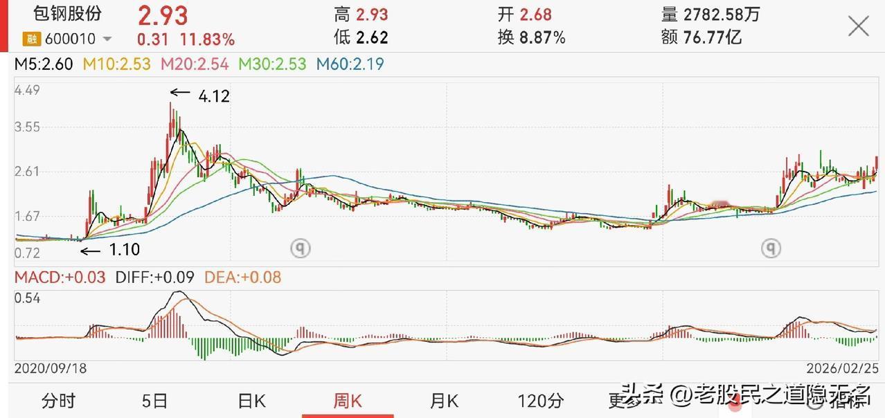包钢股份,还有一波主升浪? 1,从月线上看(下图1),牛市不缺席,图形也支持; 2,从周线上看(下图2),也比较漂亮; 3,从钢铁板块指数上看(下图3),也是正处于每一轮牛市的主升浪当中。 可以有。