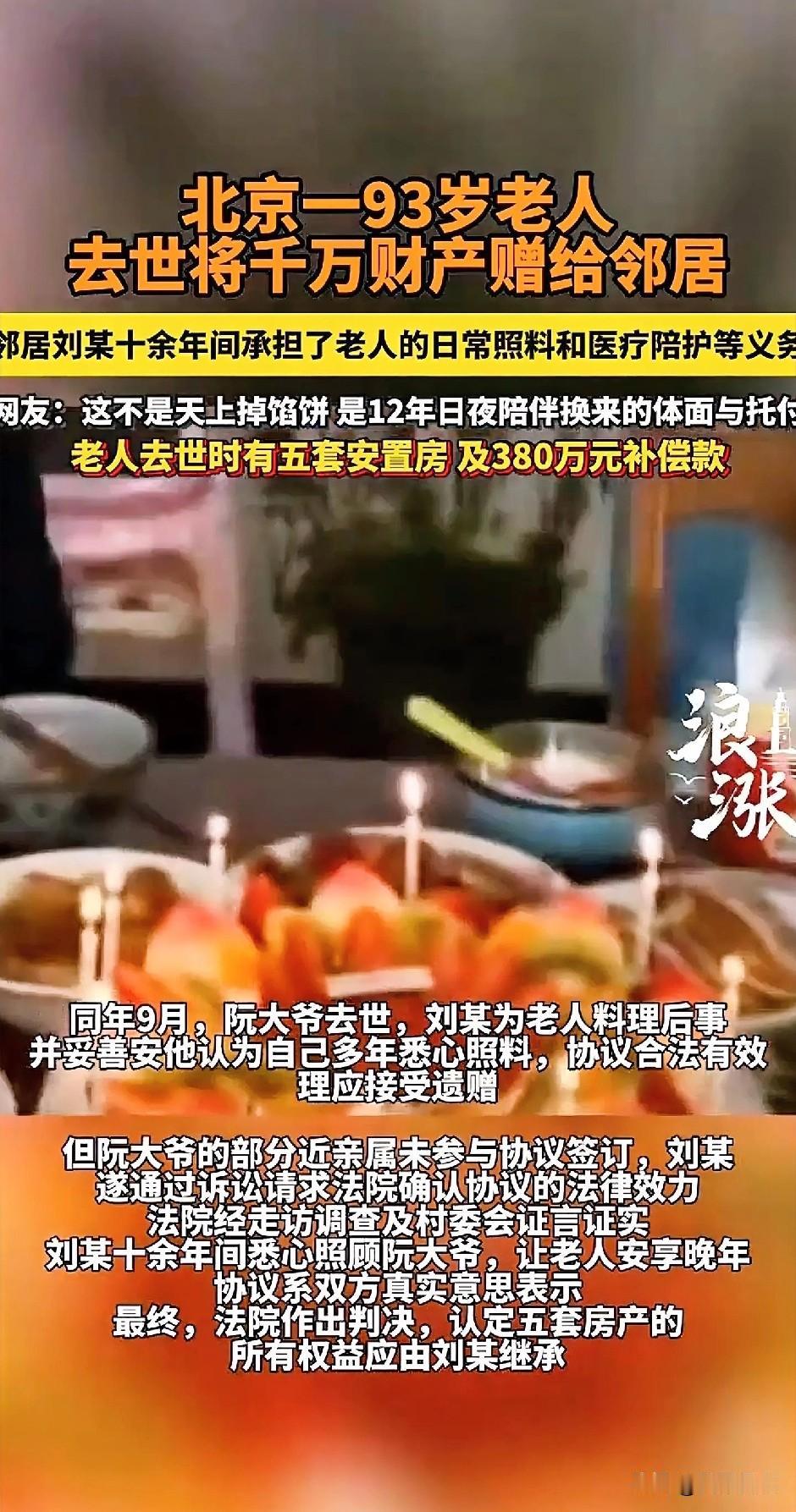 北京,一93岁老人一生无儿无女,走投无路下,他和同村一位村民签下协议,约定村民负责自己的生养死葬,其身后的380万元财产及5套安置房则全部归属对方。就这样,村民尽心尽力伺候老人,直至离世。由于离世时,老人还有5个兄弟姐妹,均为他的继承人,他们尚未认可老人签下的协议,村民也就无法拿到财产。于是,村民一纸诉状告上了法院,法院这样判了! 93岁的阮大爷,一生未娶,无儿无女。虽说有四个哥哥和一个妹妹,但各家顾各家,亲情淡薄,平时几乎不来往。 年纪越大,阮大爷越觉得孤单,吃饭、看病、起居都没人搭手,晚年过得冷清又心酸。 2011年,实在走投无路的阮大爷,找到村委会求助,希望有人能给自己养老送终,他愿意把全部家产相赠。 村干部思来想去,推荐了同村人品好、口碑佳的刘某。刘某平时就热心肠,常帮阮大爷跑腿干活,相处得十分融洽。 听说要照顾老人,刘某没有犹豫,当场答应下来。 在村委会协调下,两人签订了遗赠扶养协议:刘某负责阮大爷的吃穿住行、生病照料和身后安葬;阮大爷则将家中11间房屋及全部财产赠与刘某。 从那以后,刘某每天上门照看,洗衣做饭、端水喂药从不缺席;阮大爷生病,他第一时间送医陪护;逢年过节,他把阮大爷接到家里,不让他独自过节。 村里人都说:“亲儿子也未必能做到这样。” 2017年,阮大爷所在的村子拆迁,阮大爷一夜之间有了380多万补偿款和5套安置房。 这也引来了村里不少的闲话,有人说原本的房子没了,刘某可能变心,不会再坚持下去了,也有人等着阮大爷的亲属跳出来争家产。 可刘某依然一如既往,照顾得更加细心。 而阮大爷对这一切,看在眼里,记在心里。 2023年3月,阮大爷在律师见证下,再次签订遗赠扶养协议,并约定:由刘某负责生养死葬,自己所有财产包括5套安置房,全部归刘某。 6个月后,93岁的阮大爷安详离世。刘某按约定为老人操办后事、体面安葬,完完整整履行了所有承诺。 可老人刚走,部分亲属就跳了出来。 他们以没签字、是至亲为由,不认可协议,坚称财产该由家人继承。 一边是十几年尽心照顾的邻居,一边是多年不露面的亲属,矛盾瞬间爆发。 无奈之下,刘某起诉到法院,请求确认协议有效。 法院经过走访调查、村委会证明、邻里证言等证实,刘某12年悉心照料老人属实,且两份协议都是老人真实意愿,合法有效。 最终法院判决,5套安置房所有权益归刘某所有。 此事曝光后,网友也议论纷纷。有人怒斥亲属“生前不养老,死后争家产”的不义,有人点赞刘某的信守承诺,12年如一日的坚守,更有人感慨:“血缘从不是继承的唯一凭证,陪伴和照顾才是真亲情。” 这件事,也道尽了现实里的亲情冷暖。 从法律上讲,遗赠扶养协议的效力是高于法定继承,谁尽到赡养义务,谁就有权获得遗产。 即便是亲属,他们的继承权利也无法优先于遗赠抚养协议。 当然,从人情来讲,真正的亲情,从来不是靠血缘维系的空名头,而是实实在在的陪伴、照料与担当。 那些平日里对老人不管不顾,老人离世后却想着瓜分财产的所谓亲属,早已丢掉了亲情最本真的意义。 阮大爷的选择,不过是晚年孤独时的无奈之举。当然,他也幸运地遇到了刘某,抓住了唯一的温暖,并用自己的方式,回报了真心待他的人。 那么,看完这个故事,你觉得法院的判决合理吗?在你看来,血缘亲情和陪伴照料,哪一个更有资格继承老人的遗产呢? 欢迎大家在评论区留言。
