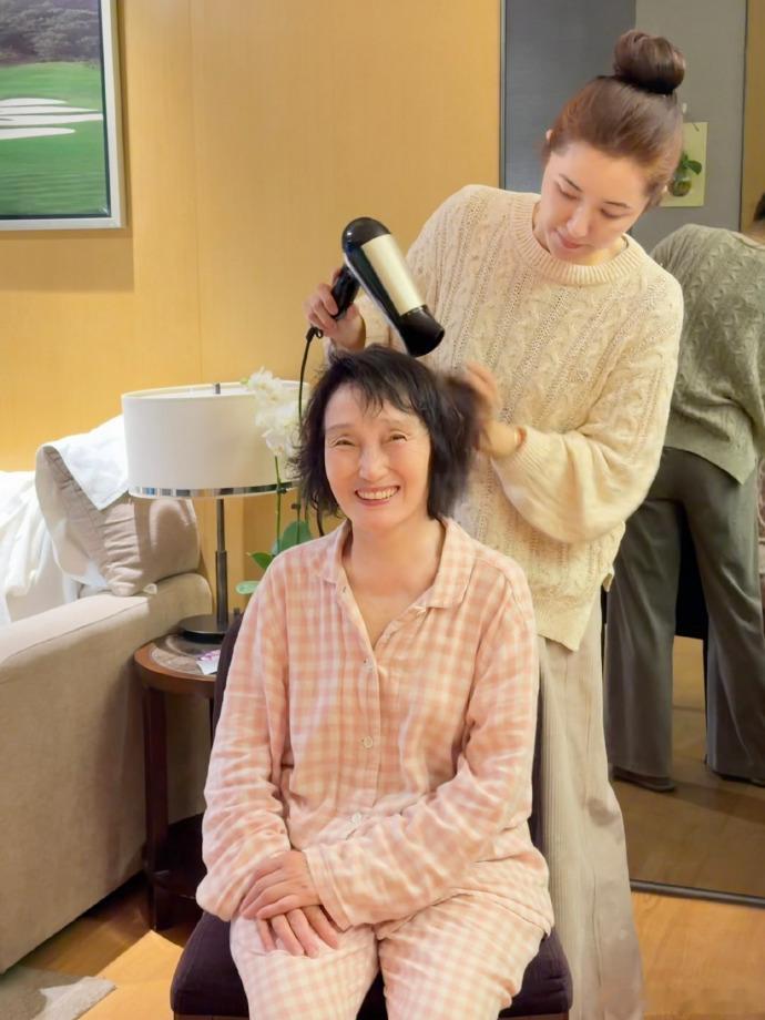 曾黎给76岁妈妈染头 比起光鲜的红毯造型,更爱看曾黎这样的居家日常。为妈妈染头发