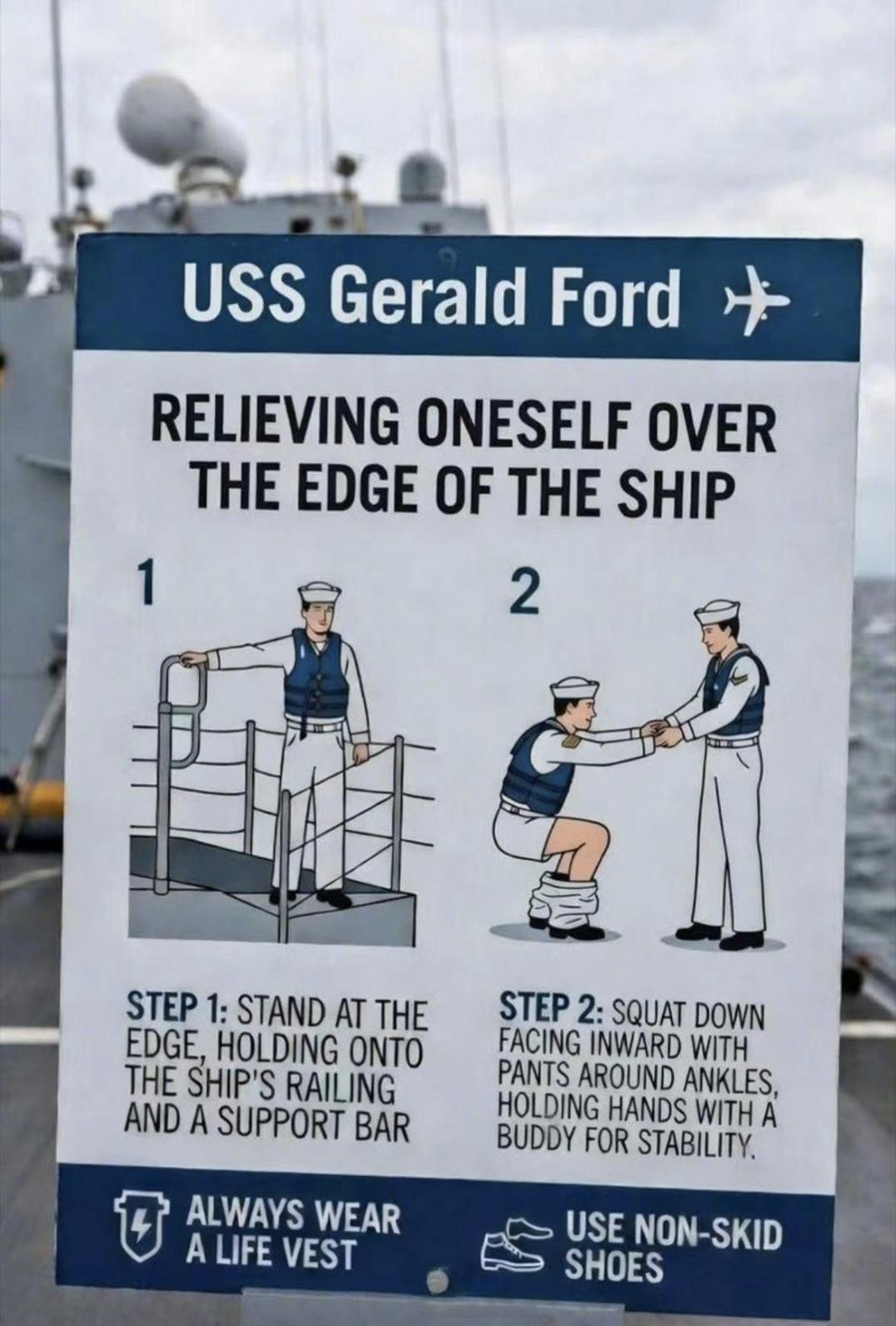 130亿美刀打造的电弹舰母本以为是威风凛凛出门巡场,结果半路被自家厕所给拿捏了? 船上650个真空马桶近九成失灵,动不动就堵,管道细、脾气大,稍微有点东西就罢工,几千号人天天排队等空位,堪比早高峰挤地铁。本来是战力拉满的海上巨兽,如今被人调侃“战斗力不如一套马桶”。(图②是网友调侃的“解决办法图,纯属搞笑) 没办法,只能临时停靠休整,一边修管道一边解决刚需。花了这么多钱,最先进的设备全上了,偏偏栽在最基础的生活问题上。这下好了,威名没震住别人,反倒让“厕所危机”名扬四海,成了大家茶余饭后的快乐素材。