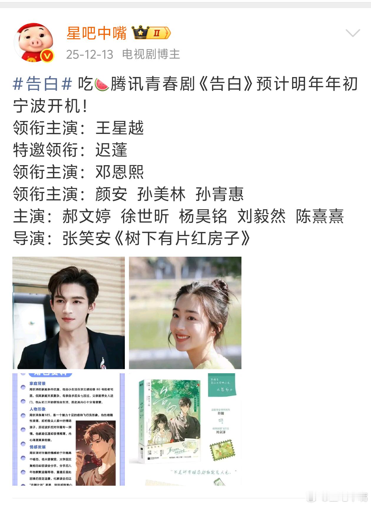 电视剧告白官宣告白 芒果TV/湖南卫视青春剧《告白》官宣!即将开机!领衔主演:王星越 领衔主演:邓恩熙 领衔主演:颜安 孙美林 孙寈惠 主演:郝文婷 徐世昕 杨昊铭 刘毅然 陈熹熹导演:张笑安《树下有片红房子》