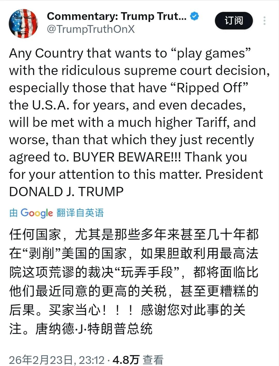 特朗普2月23日发文警告称:“任何国家,尤其是那些多年来甚至几十年都“剥削”美国的国家,如果胆敢利用最高法院这项荒谬裁决“玩弄手段”,都将比他们最近同意的更高的关税,甚至更糟糕的后果。买家当心!!” 特朗普发起的“关税战”,这“交易艺术”被美国最高法院裁决为“违宪艺术”后,显然使特朗普非常着急紧张起来了,才会发出霸道的威胁言论。 据彭博社分析认为,美国最高法院这项裁决,受益者包括其竞争对手中国、印度、巴西等,随着特朗普的竞争性惩罚措施消失,这些国家对美出口商品将享受更低的关税。 其实,美国最高法院的裁决“关税战”违宪的结果,真正让特朗普紧张的极有可能是已经与美国达成协议的国家或地区,特别已承诺对美国产品开放市场、购买美国农产品及到美国进行巨额投资的落实可能因此发生改变,比如欧盟、日本、韩国及中国台湾地区等都承诺到美国建厂进行巨额投资或购买美国大量农产品等,这可都是特朗普让美国制造业重新回归的最重要推力,也是特朗普履行选举对支持者的承诺。然而,特朗普政策朝令夕改、动辄撕毁协议、毫无契约精神,比如近日一个行政令又将对全球各国关税从10%提升至15%,这无疑在逐渐消耗美国的信誉,一旦信誉受损,对在美国投资者会造成直接影响。