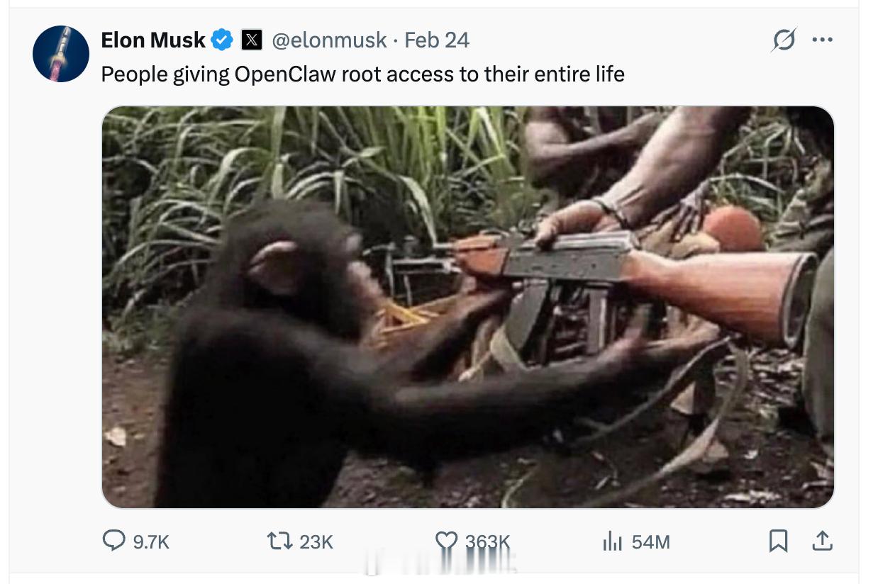 Openclaw选择与OpenAI合作之后,谷歌开始大面积封禁用户帐号。关于openclaw,马斯克给出了图4这样的一个绝妙比喻。