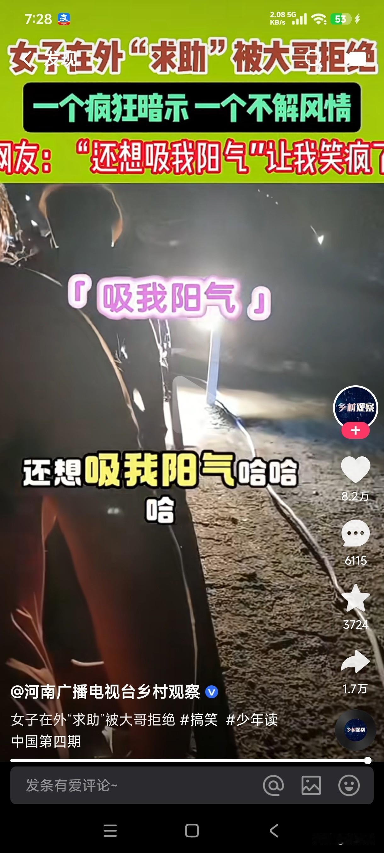 女子爬山求助男子帮忙,男子问到帮什么忙,女子问男子会不会人工呼吸,男子说他又不是医生护士,女子说不会我教你,男子说你是想吸我阳气吧…… 这样的搭讪方法真是笑死人了,一个在不断的疯狂暗示,一个却不解风情,这女子看上大哥了,没想到大哥却油盐不进,这是大哥故意揣着明白装糊涂,还是他压根就没有看上女子?谁能想到初次见面居然问对方会不会人工呼吸,然而对方却说他又不是医生,也不是护士,会那玩意干什么,没想到女子却说不会自己可以教他,自己爬山爬累了,心跳加速呼吸困难,想让大哥帮忙给他人工呼吸,没想到大哥却说女子是想吸他的阳气,瞬间惹的旁边的人哈哈大笑,这大哥是不是太实在了?还是求他帮忙的女子长的没入大哥的眼?