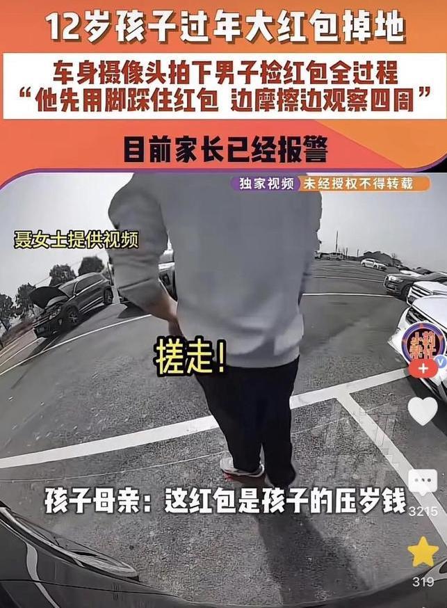 这钱能要回来吗?河南洛阳的一个服务区里,贾女士的孩子满心欢喜攒下的压岁钱红包,短短几分钟里,被男子耍心眼的小动作,揣兜里拿走了!网友直呼:这男子脸都不要了! 事情是这样的,2月22日。聂女士一家开车赶路,停在服务区歇脚,孩子急匆匆跑向洗手间,完全没发现兜里装着12550元的红包,已经从口袋里滑落到了地上。等孩子脸色发白、带着哭腔跑回来说红包丢了的时候,聂女士的心一下子就揪紧了。她马上调了车上的行车记录仪,结果看到的画面,让她又气又无奈。 视频里,一名穿白衣、戴墨镜的男子,在车旁边来回走了两圈。他明显看到了地上的红包,却没有第一时间捡起来。先是装作没事一样左右看了看,确认周围没人注意,才慢慢挪着步子走过去,抬起脚,精准地踩住了地上的红包,还不着痕迹地碾了两下,像是在确认里面的厚度。等确定里面是现金之后,他动作飞快地弯腰捡起来、塞进口袋,整套动作一气呵成,随后就装作什么都没发生,快速钻进一辆陕E牌照的车里,直接开走了。 这段视频曝光之后,网友们的评论也分成了两派: “拾金不昧本来就是该有的美德,一个大男人,还用脚踩、用脚碾的,这吃相也太难看了,必须报警找人!” “这事家长也有监护不到位的错,人家是捡不是偷,你这么理直气壮发视频,反而容易把事情闹僵,好好说说不定人家就还了。” 其实,这件事站在道德和法律的边界上,远比我们看上去要复杂。老话说 “君子爱财,取之有道”,从道德上来说,这个男子的做法肯定是不妥当、不光彩的,但真要走法律程序,聂女士也面临着很现实的难题。 按照民事诉讼里 “谁主张谁举证” 的原则,就算监控清清楚楚拍到了他捡走红包,可红包里到底有多少钱?是聂女士说的 1255 元,还是只有空红包? 如果男子一口咬定捡到的就是个空包,聂女士拿不出 “捡拾瞬间红包内金额” 的直接证据,法律上也很难认定。 这个事也给聂女士一个教训,这么多的钱红包怎么能让孩子拿着呢?聂女士的粗心大意也是造成这件事情的根源之一! 对此你是怎么看的?