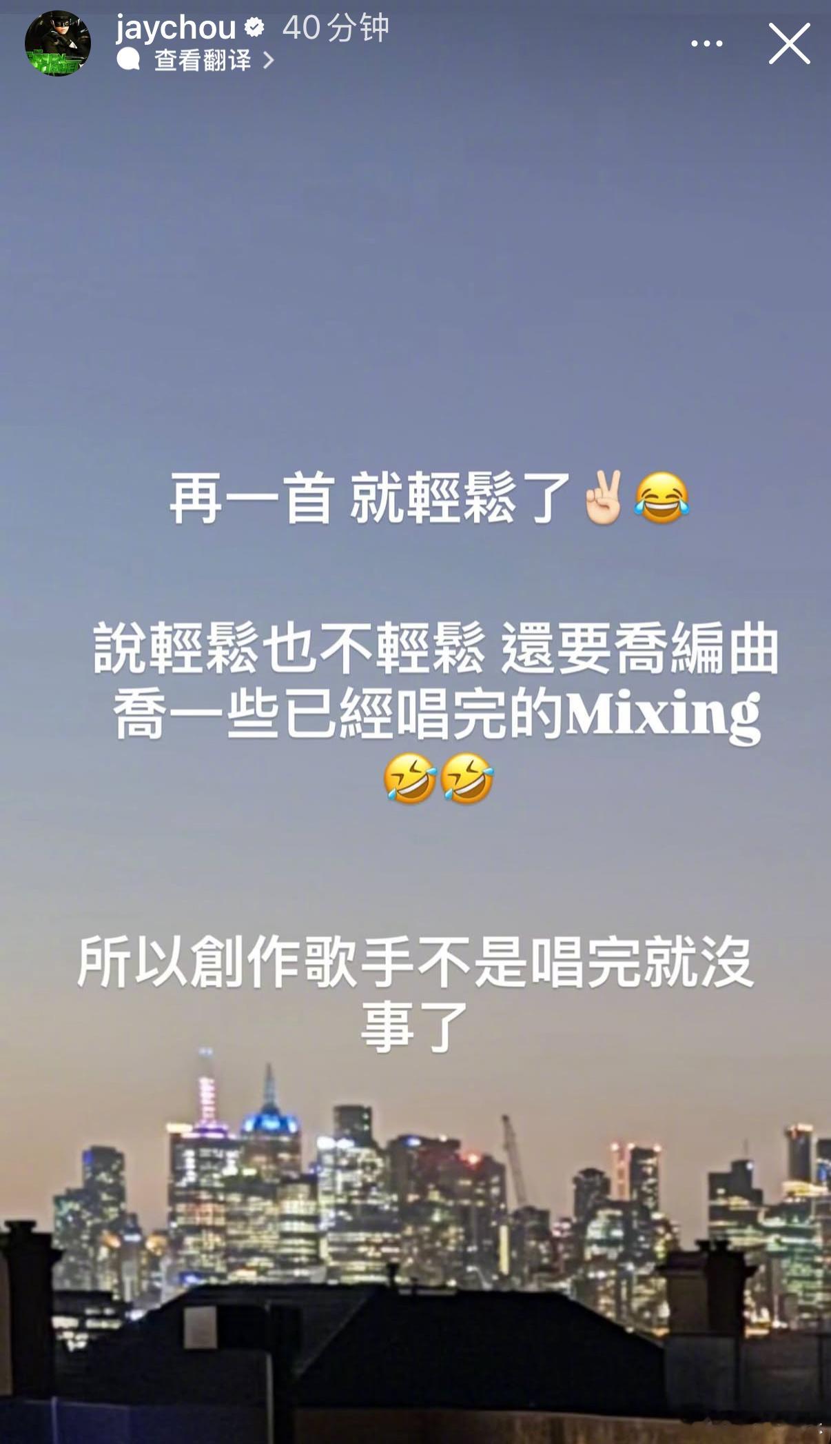 周杰伦说新专辑再一首就轻松了周杰伦说创作歌手不是唱完就没事了 24日晚,周杰伦发ins限时动态,透露新专辑再一首就轻松了,还称说轻松也不轻松,还要定编曲、一些已经唱完的Mixing,“所以创作歌手不是唱完就没事了。”