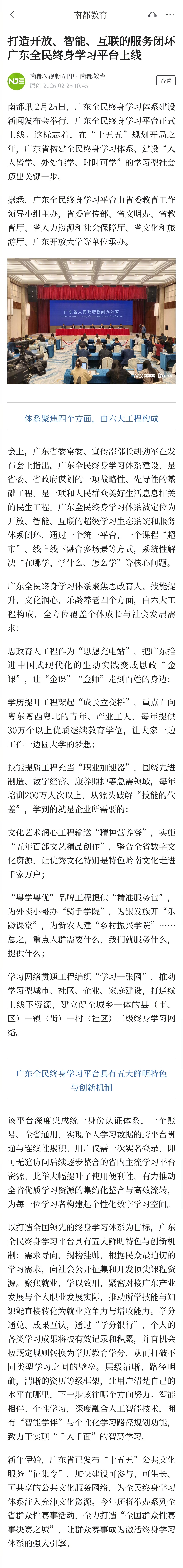 【打造开放、智能、互联的服务闭环 #广东全民终身学习平台上线#】#终身学习让广东更有活力# #在广东遇见更好的自己#2月25日,广东全民终身学习体系建设新闻发布会举行,广东全民终身学习平台正式上线。这标志着,在“十五五”规划开局之年,广东省构建全民终身学习体系、建设“人人皆学、处处能学、时时可学”的学习型社会迈出关键一步。