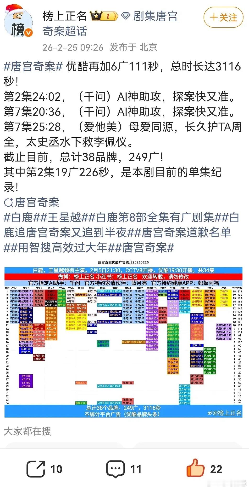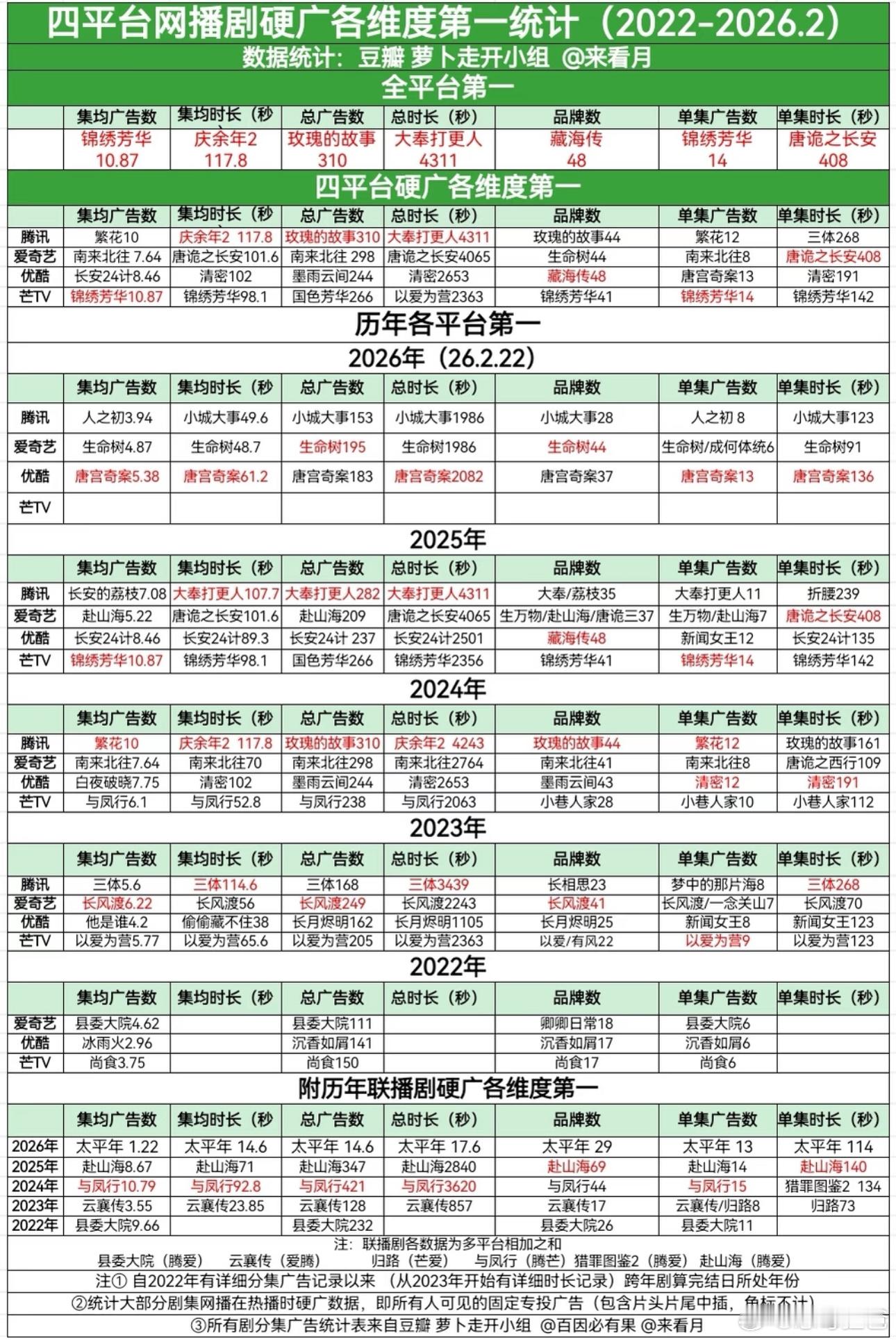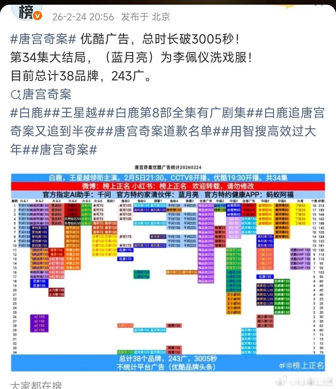 都说广告能体现剧播的好不好白鹿的唐宫奇案超点后连续加了三次广无ip大厂加持单流量 创平台单集广告数史冠 今年全平台集均广告数 单集广告数 单集广告时长 总时长 集均时长第一 连续5年8部剧全集有广 白鹿伟大