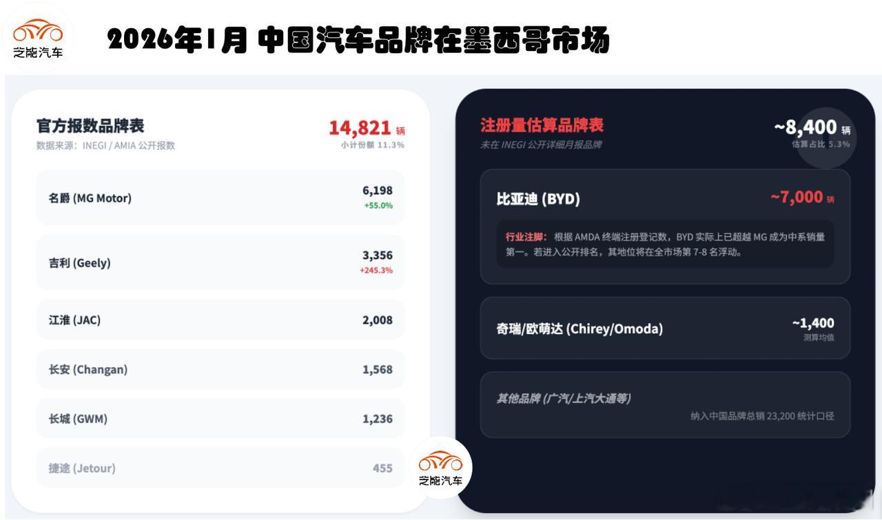 2026 年 1 月墨西哥车市创下历史新高,整体保持增长。不过从年初开始,当地上调了非自贸区汽车进口关税,对中国品牌影响不小。