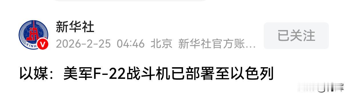 打不过歼16还打不过米格29吗?美军F22已部署到以色列,途中坏了一架 根据以色列媒体近期发布的消息可以得知,24号当天12架美军F22战斗机从英国起飞前往以色列南部的一处空军基地,飞行过程中一架F22突发故障,中途返航。实际到达以色列进行部署的数量是11架。 在当前局势下,美国人把最先进的隐身战斗机派到以色列,根据以色列媒体的分析,就是在防范伊朗有可能对以色列发动的突袭。 看到F22让我想起春节期间央视对外发布的视频中出现的一幕,再次回顾了去年我们的歼16重型战斗机在东海上空以一敌二锁定逼退某国隐身机的相关消息。当时我们的飞行员在采访中说,那两架飞机被逼走后,再也没有露过面。从这句话中能看出,出现在东海上空的隐身机就是F22。因为F35从2017年部署在日本,一直到现在为止,还会时不时的出现在东海周边的空域,不可能是它! 堂堂的最著名的5代机被4代机压制,这种情况对于美国人来说肯定是比较郁闷的。然而这并不代表F22是落后的,在中国周边搞不定歼16不代表人家不能在其他地区称王称霸。伊朗空军最主力的平台是三十几架米格29,这种俄制三代机对于F22来说,绝对能做到单方面的碾压。打不过歼16难道还打不过米格29吗?