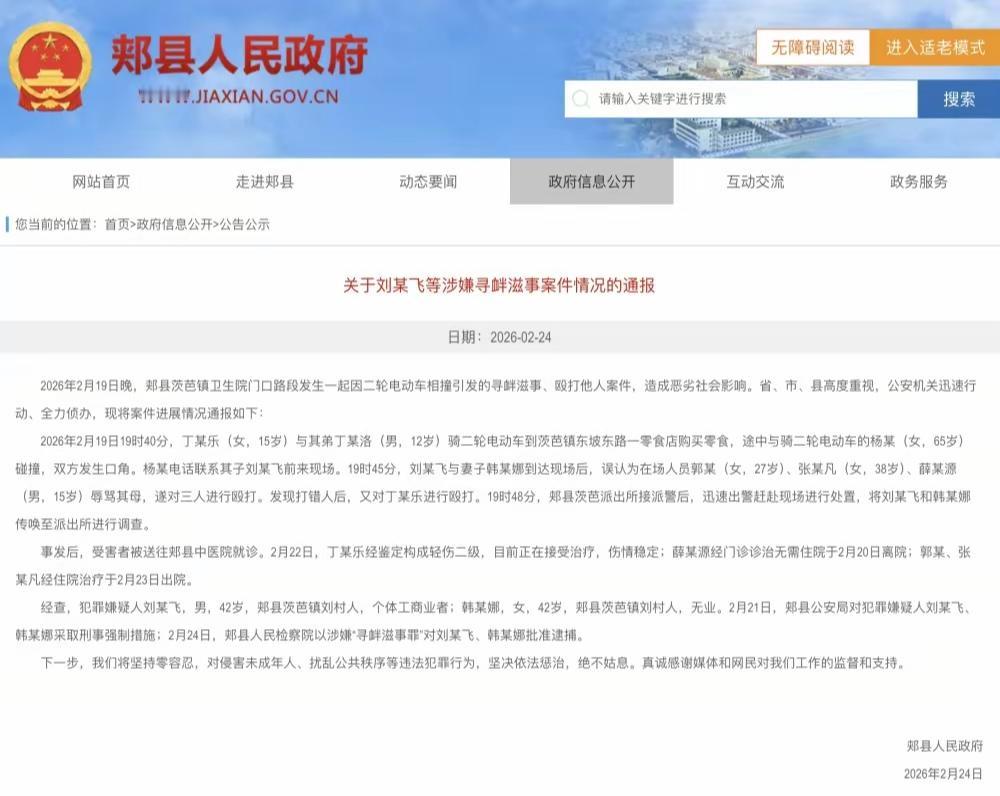 夫妻当街殴打15岁女孩,河南平顶山官方再通报,抓得不冤。 电动车与电动车发生碰