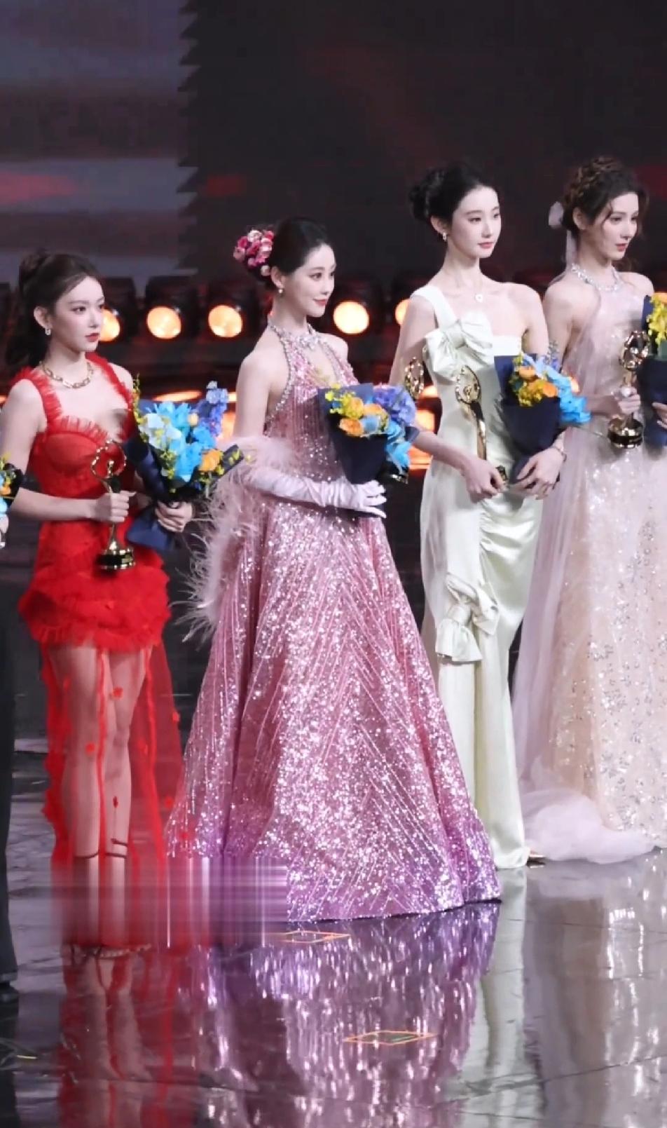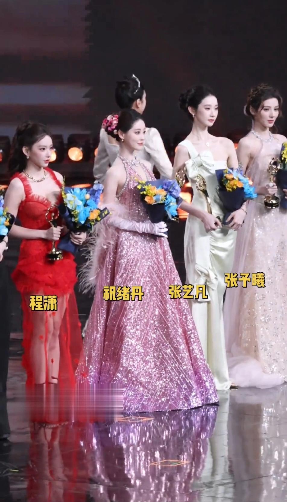 程潇有绝对的美貌,张艺凡亭亭玉立,气质优雅,张予曦顶着一张完美建模脸,祝绪丹在这三个人中间确实显得普通了些,不论身材还是样貌都没有特别突出的点,祝绪丹的礼服挑选的也有点失败,这亮晶晶的粉色再搭配头上的花就是妥妥的影楼风,她的礼服看起来质感真的不如其他三人。如果身材样貌都没那么突出,想在娱乐圈出人头地真的很难!程潇