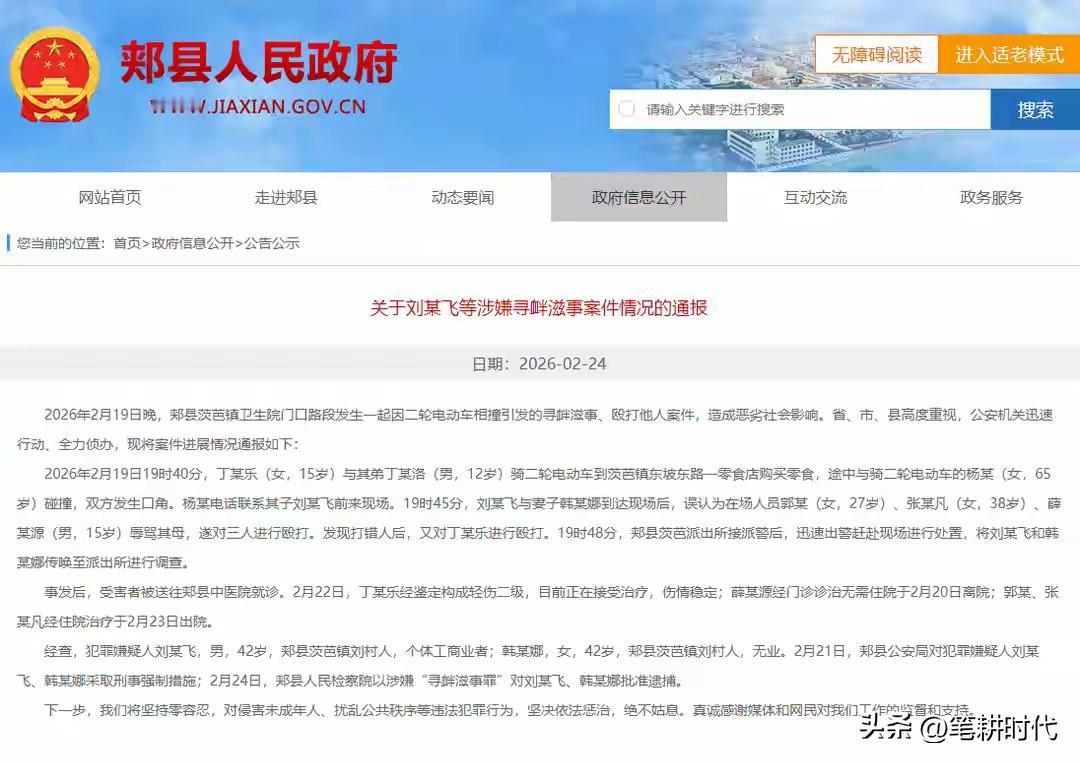 代价来了!15岁女孩被殴打事件,官方再次通报,两打人者涉嫌“寻衅滋事罪”被批捕!竟然还错打了三个人。 老太婆一个电话,刘某飞与妻子赶紧到达现场后,误以为三人辱骂其母,就对他们三人殴打,当发现打错人后,又继续打。 两个电动车相蹭可以追查是谁的责任,为何到来就大打出手? 这个家伙多么嚣张啊。不知道以前在当地多么霸道,不严惩。不平民愤。 这下玩完了,15岁女孩轻伤二级,伤情稳定,再加上是未成年人,起步应该5年吧?该重判附带民事责任赔偿和精神损失费! 平时就是嚣张跋扈惯了,一点小事就召集一伙人不问青红皂白上来就打人。 对无知愚昧蛮横野性的夫妻严惩,给没成年孩子一个交代!对小女孩造成的身体伤害,心理阴影也许是终生的!