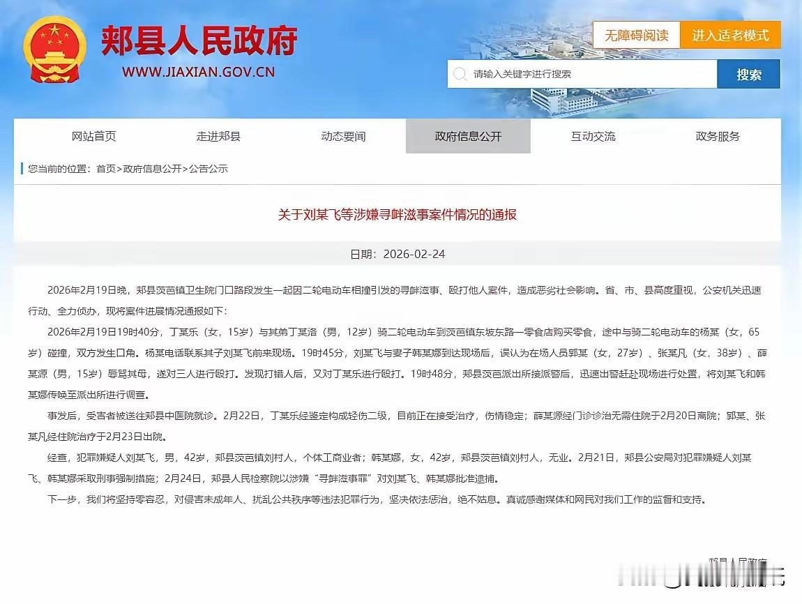 5天!从案发到批捕,只用5天! 2月19日案发,21日刑拘,24日郏县检察院以涉嫌“寻衅滋事罪”对刘某飞、韩某娜批准逮捕! 如果那天挨打的是你女儿,你什么感受? 郏县街头,一对夫妻当街对15岁女孩动手! 女孩哭喊、求饶,对方根本没有停手的意思! 更让人心寒的是,旁边还有人起哄拍照,没一个人上前阻拦! 说实话,看到视频那一刻,心里堵得慌。 15岁的孩子,凭什么要遭受这些? 但结果出来后,长舒一口气。 从案发到批捕,不到一周! 郏县公安、检察院,这波行动给力! 施暴者被依法处理,女孩安全了! 法律的重拳,比任何暴力都更有力量! 如果你在现场,你会怎么做? 郏县茨芭镇打人 夫妻殴打15岁女孩5天被批捕