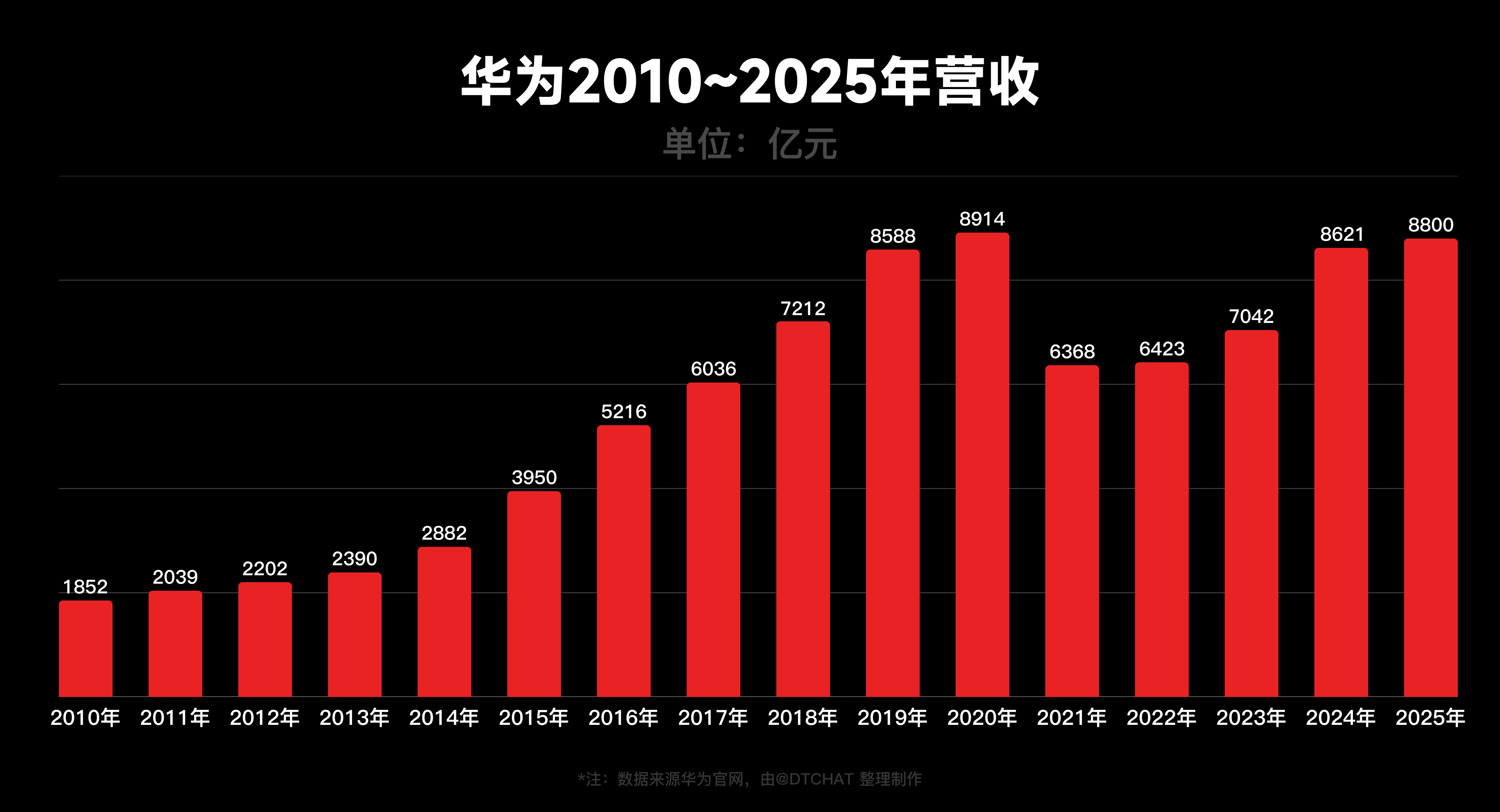 2010年:营收1852亿,研发177亿2011年:营收2039亿,研发237亿2012年:营收2202亿,研发297亿2013年:营收2390亿,研发315亿2014年:营收2882亿,研发408亿2015年:营收3950亿,研发596亿2016年:营收5216亿,研发764亿2017年:营收6036亿,研发897亿2018年:营收7212亿,研发1015亿2019年:营收8588亿,研发1317亿2020年:营收8914亿,研发1419亿2021年:营收6368亿,研发1427亿2022年:营收6423亿,研发1615亿2023年:营收7042亿,研发1647亿2024年:营收8621亿,研发1797亿2025年:营收超8800亿,研发超1800
