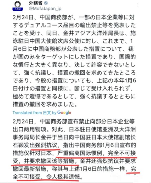 日本暴怒抗议! 日本出来回应了! 在我们将20家日本实体纳入管制清单之后,日本非常的愤怒!2月24日,日本外务省发表声明声称,中国商务部宣布对部分日本企业等实施两用物项出口禁令,日本已经对中国驻日本大使馆公使提出交涉。此前,针对中国商务部1月6日公布的相关措施,日本方面已明确表示:该措施仅以日本为对象,与国际通行惯例严重不符,绝对无法接受,并已提出强烈抗议,要求中方撤销相关措施。 很显然,对于我们的管制手段,日本非常不满,认为这不符合国际惯例,要求我们撤销。当然,我们会不会撤回呢?显然,要我们撤回,那是做梦。 根据商务部2月24日的公告,这20家实体包括三菱造船、川崎重工航空宇宙系统公司等,基本涵盖了日本海上、空中乃至太空军事力量的核心产业链,不少企业都在研制进攻性武器。 就拿大家比较熟悉的三菱重工来说,其旗下多家被管制的子公司,不仅参与了日本高超音速武器的研制,还负责建造服务于钓鱼岛方向侵权的海警船,甚至帮菲律宾建造用于南海方向侵权的舰船,一边从中国获取商业利益,一边帮日本扩充军力、挑衅中国,这样的企业,我们凭什么不能管制? 还有川崎重工,作为日本主要的飞机和发动机制造商,长期参与日本航天军事化项目,为日本的军事扩张提供关键支撑,对这样的实体实施管制,既是维护我们自身的安全,也是在遏制地区局势的恶化。 还有日本嘴硬说的“不符合国际惯例”,这话纯属自欺欺人。当前全球各国都在强化两用物项的出口管制,美国有专门的出口管制条例,欧盟也在不断扩大高新科技物项的管控范围,管控趋势越来越严格。 而我们的管制措施,有着明确的法律依据,2020年生效的《出口管制法》和2024年实施的《两用物项出口管制条例》,构建起了完善的管控体系,我们的每一步操作,都符合法律规定,也契合全球防扩散和维护国家安全的普遍共识。 日本之所以这么愤怒,本质上不是因为“不符合惯例”,而是因为我们的管制精准打在了他们的痛处。 要知道,日本的军工企业高度依赖中国的稀土等关键原材料,比如镝、钇等稀土元素,是制造武器、飞机的核心材料,而日本70%的稀土进口都依赖中国。 我们切断对这些军工实体的两用物项供应,就等于卡住了日本军工扩张的“脖子”,公告发布当天,东京股市的防务板块就遭遇抛售,三菱重工、IHI公司等股价大幅下跌,这才是日本急着抗议、要求撤销措施的真正原因。 而且大家要清楚,我们的管制措施并不是针对所有日本企业,也没有影响中日正常的经贸往来,商务部已经明确表态,相关措施仅针对少数参与提升日本军事实力的实体,诚信守法的日本实体完全无需担心。 我们这么做,目的很简单,就是制止日本的“再军事化”和拥核企图,近几年日本不断突破和平宪法,大幅增加防卫预算,谋求“反击能力”,甚至干涉中国内政、发表涉台错误言论,中方的管制,就是对这种危险动向的正当反制,是忍无可忍后的必要举措。 说到底,国家与国家之间的相处,讲究的是相互尊重,你不挑衅我,我就不会为难你;你要是执意干涉我的内政、威胁我的安全,我就必然会拿出反制措施。 日本想要我们撤销管制,其实很简单,只要停止军事扩张,停止干涉中国内政,回归和平国家的定位,不再做危害地区和平稳定的事情,我们自然不会采取相关措施。 但如果日本继续执迷不悟、我行我素,那我们的反制措施只会越来越严,想要我们妥协撤回,绝无可能。 信息来源: 新华网《商务部公告2026年第11号 公布将20家日本实体列入出口管制管控名单》(2026年2月24日) MCN双量进阶计划