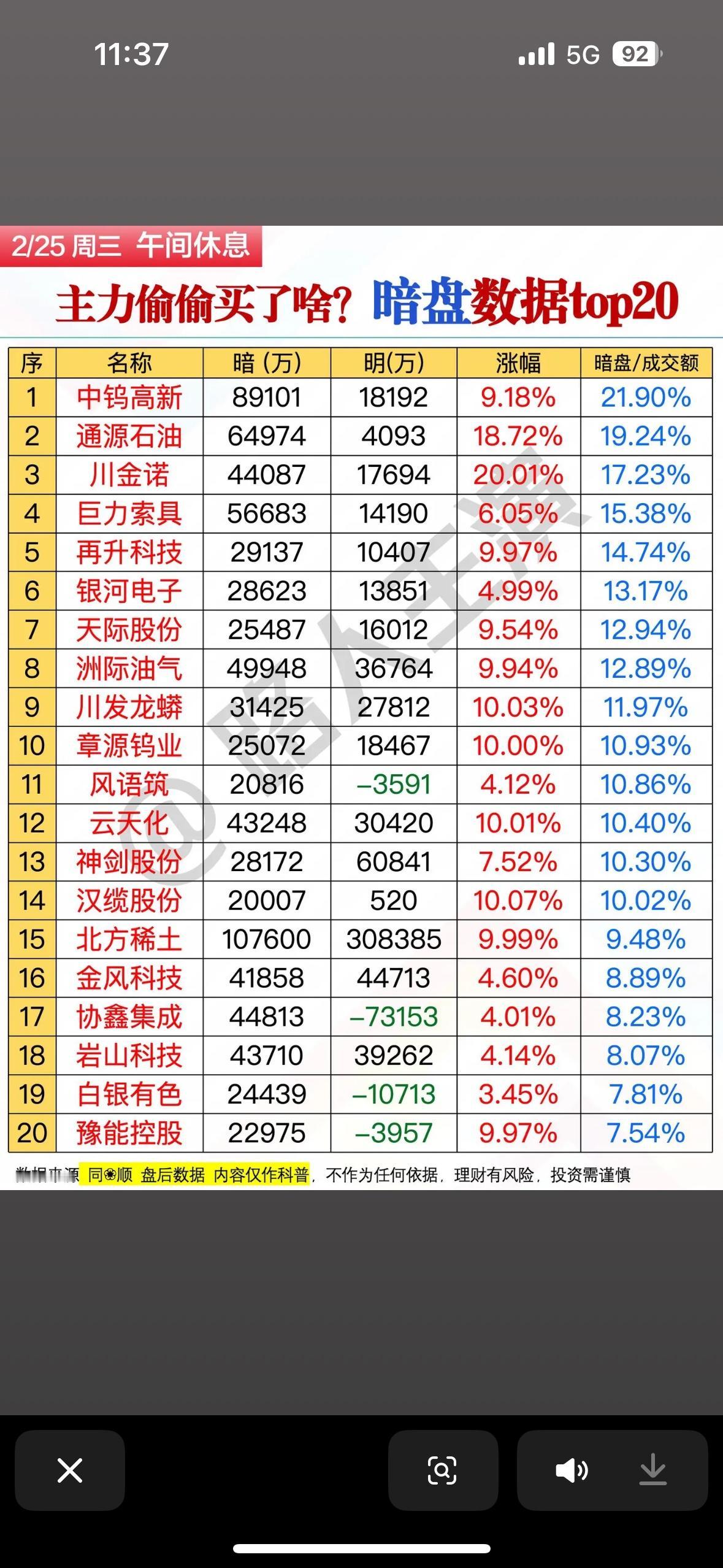 2月25日暗盘数据Top20,主力偷偷买入的股票揭秘!