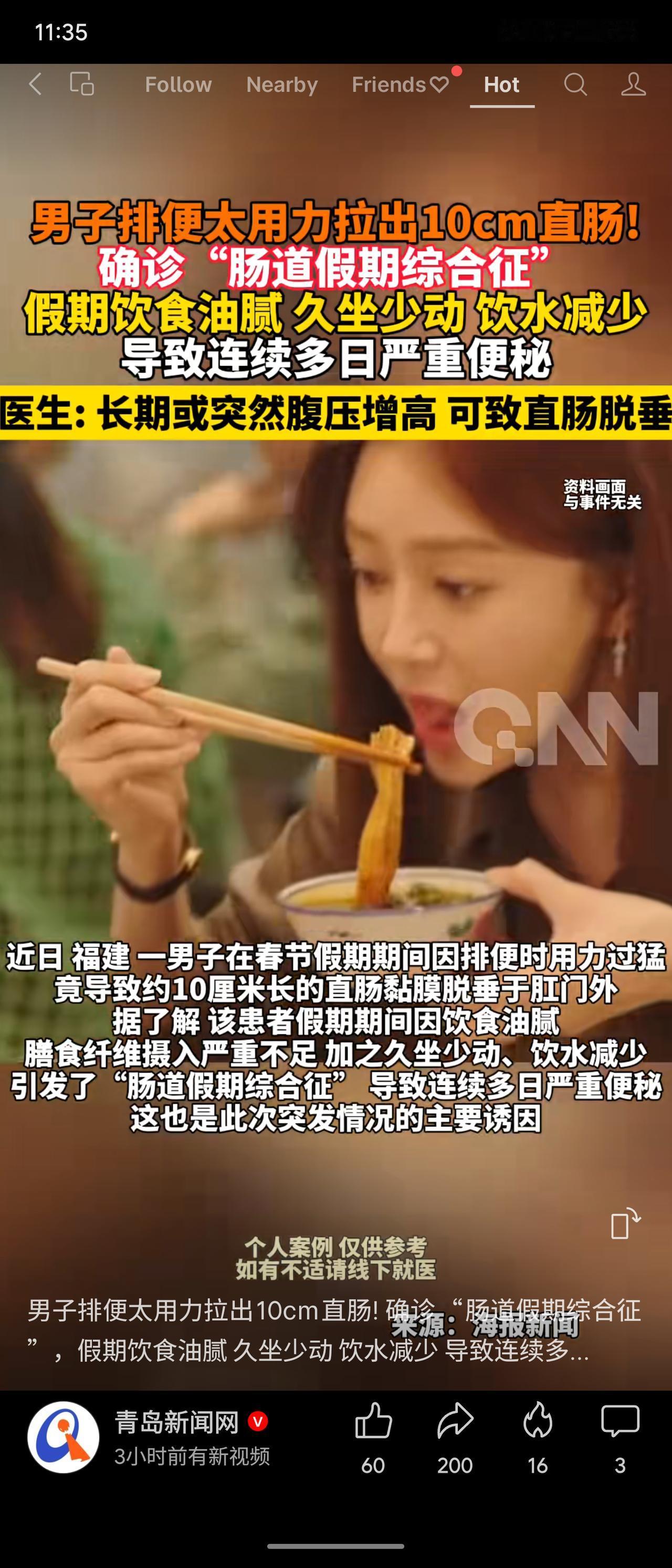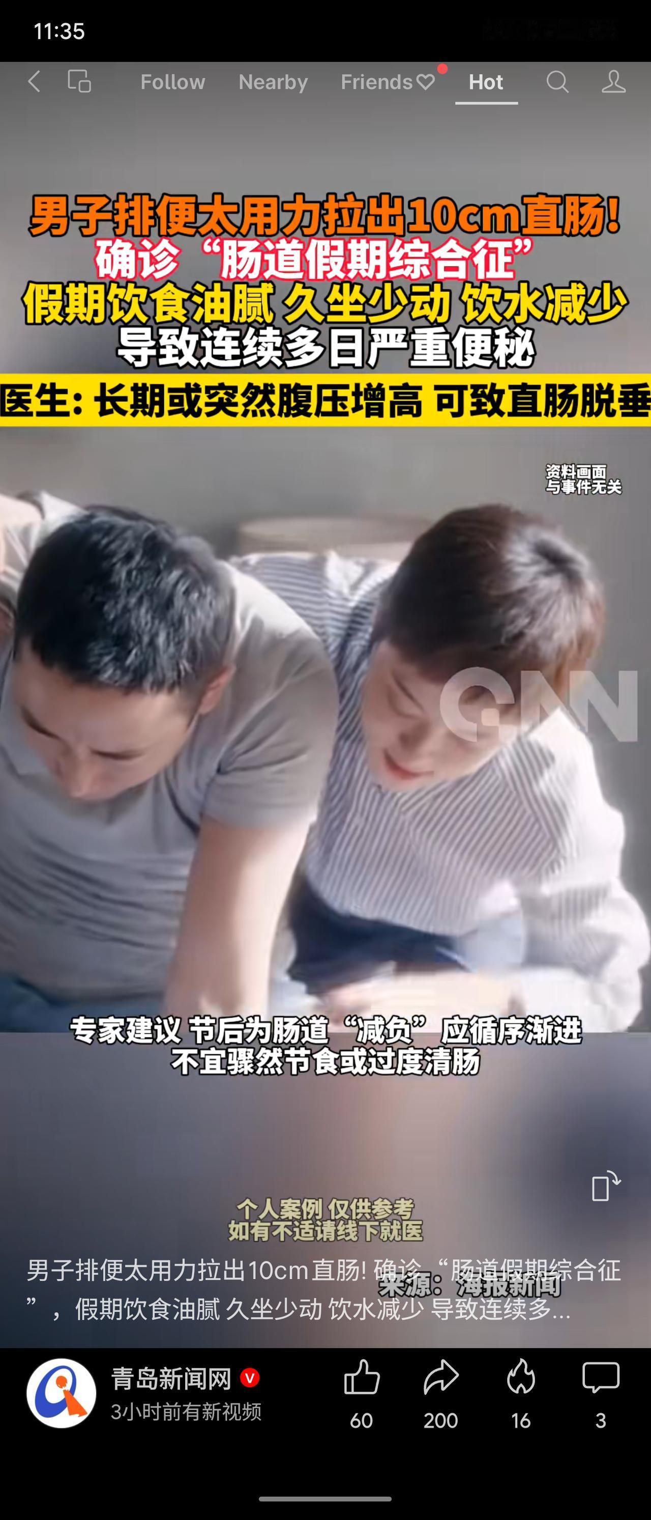 福建一男子因“肠道假期综合征”,排便用力过猛导致约10厘米直肠脱垂。医生提醒,腹压增高可致脱垂,节后为肠道减负应循序渐进。