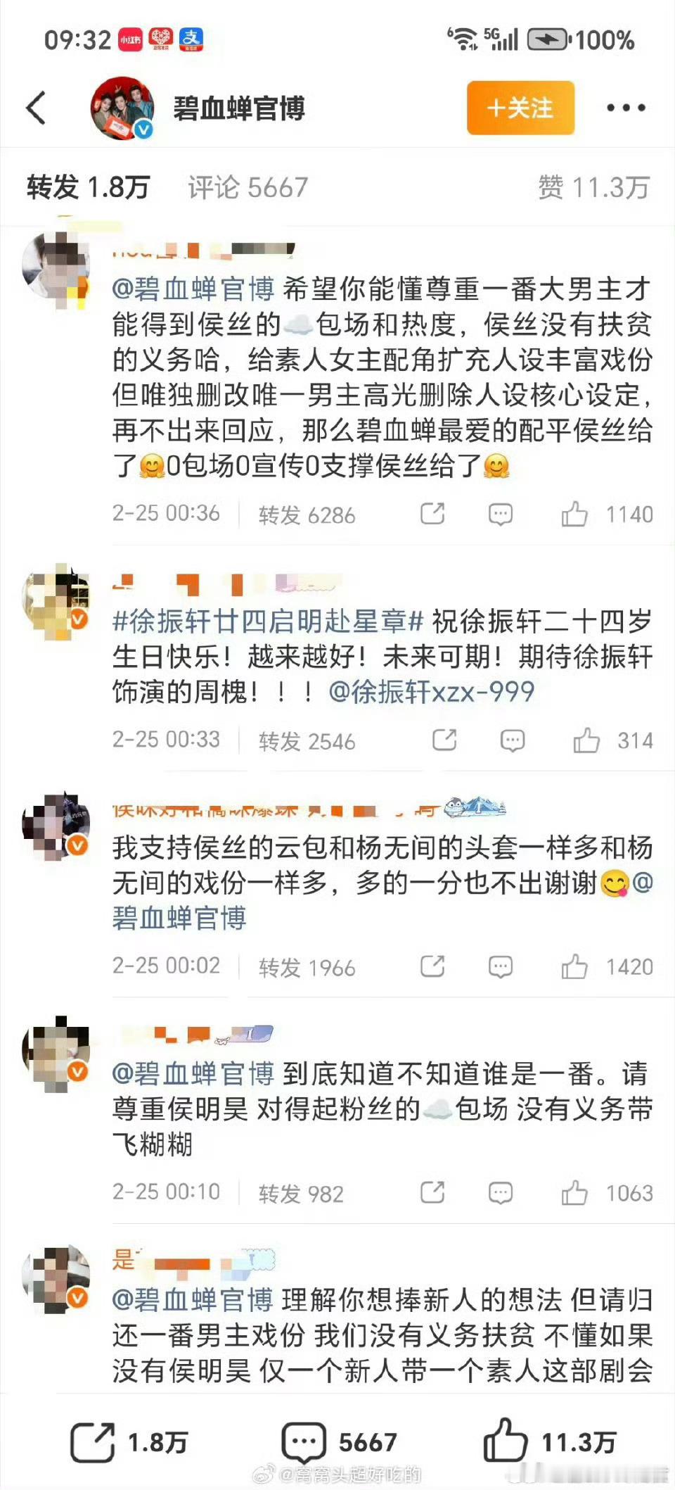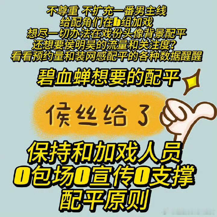 侯明昊粉丝为碧血蝉杨无间发声,拒绝配平,要求剧组尊重一番男主侯明昊。影视寒冬越来越多维权了,AB级的剧不好开,zyk们这是都来s级的剧加线了吗? 长剧的核心让配角们的戏份喧宾夺主会劝退观众的,大部分看剧的观众还是喜欢主次分明的剧