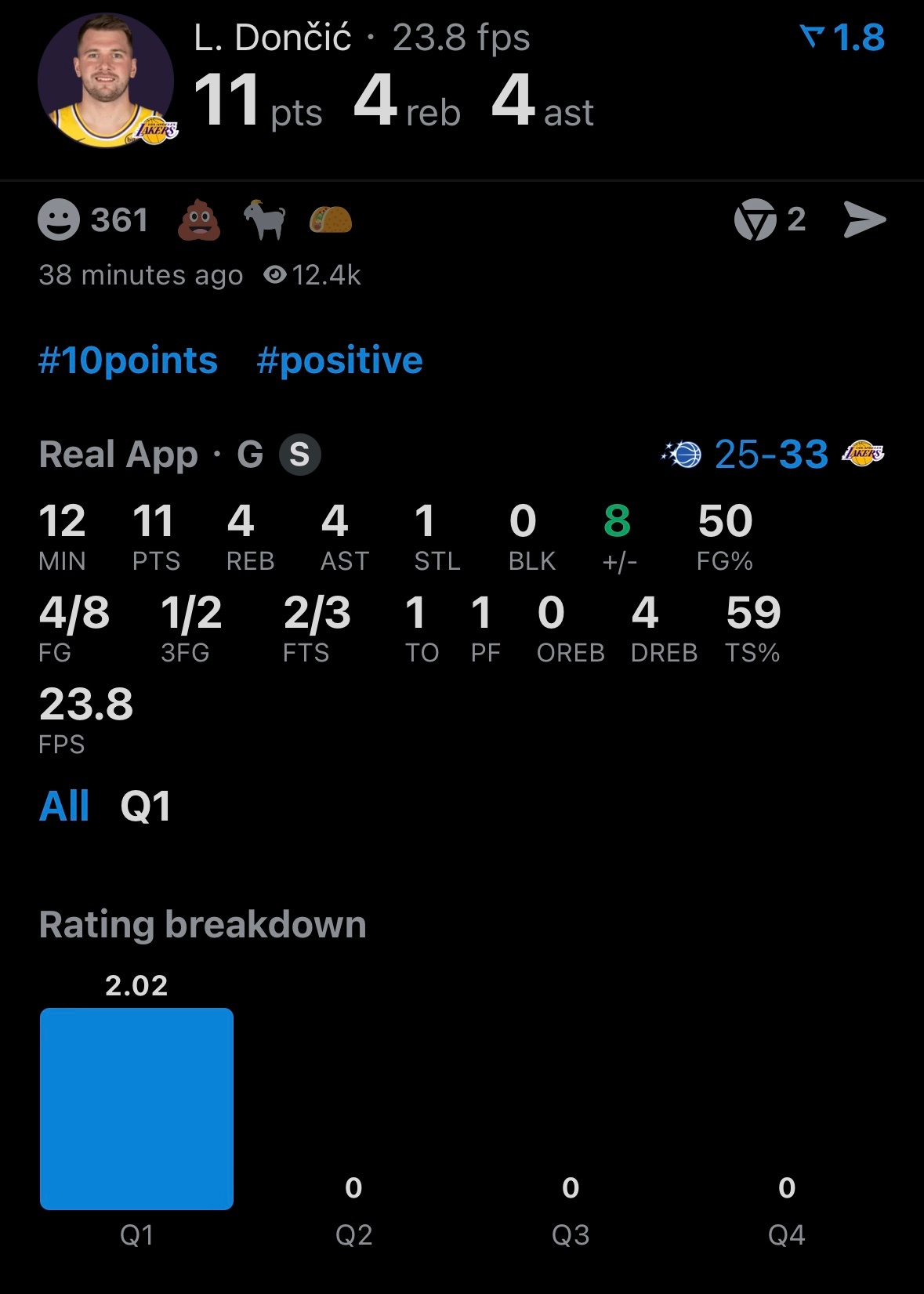 第一节,湖人33-25魔术,东契奇11分4板4助攻。