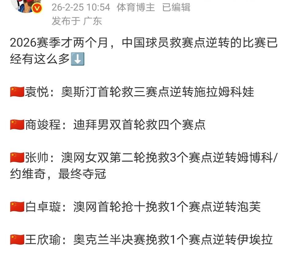 人美心善的袁悦运气爆棚啊!佩古拉退赛,袁悦作为幸运落败者替代她的签位。随即上演惊天大逆转! 奥斯汀250赛女单首轮,她在4-6/4-5(0-40)对手发球胜赛局挽救3个赛点,最终4-6/7-5/6-1逆转斯拉姆科娃。 2024年奥斯汀女单冠军 2025年奥斯汀女双冠军 2026年奥斯汀……