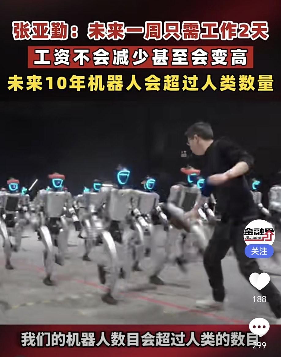 张亚勤中国工程院外籍院士,预测未来10年机器人数量超人类,人类一周工作2天工资还更高,这消息一出打工人直接吵翻。 2026年2月他的演讲刷屏,话题阅读量破10亿。评论区分成两派,有人狂喜,想着终于能摆脱996,过上悠闲生活。也有人吐槽,别说这些没用的,先让我们每周休息两天再说。 A网友:未来只需要工作两天?NO,未来只有40%的人有工作才是真的,而且会更加卷。薪水是不会减少,但是很多人被AI取代将失业。 B网友:如果一个人只工作两天,那么他的工作是不饱和的,作为资本家老板,可以开除2个人,让剩下的那个人做3个人的工作,拿一份工资。 C网友:有电脑的时候大家也是这样想的。在一个双休都完不成的大地上,谈未来只工作两天。想得美,资本不会有那么好心的。听一句劝,“专家的话别信”。 D网友:这些人是真坏,搞这些东西来丰富自己的资产,剥夺普通人工作的机会。资本都是逐利的,不会养闲人,那不叫工作2天,那叫失业5天。 有人说张亚勤可不是随便说说,他在人工智能领域深耕40年,是权威专家。 他说2035年机器人超70 - 80亿,AI能放大人类智商。可重复性的工作会被替代,不过也会创造新工作。就像以前有视频会议,大家以为出差会减少,结果现在反而更多。机器人创造新工作的同时也会改变就业格局。这预测挺诱人,但实现还得看技术发展和社会变革走向。 大家是希望这一天早点到来,告别996,开启悠闲高薪生活! 还是继续做牛马维持现在的工作状态?欢迎大家留言,发表自己的看法。