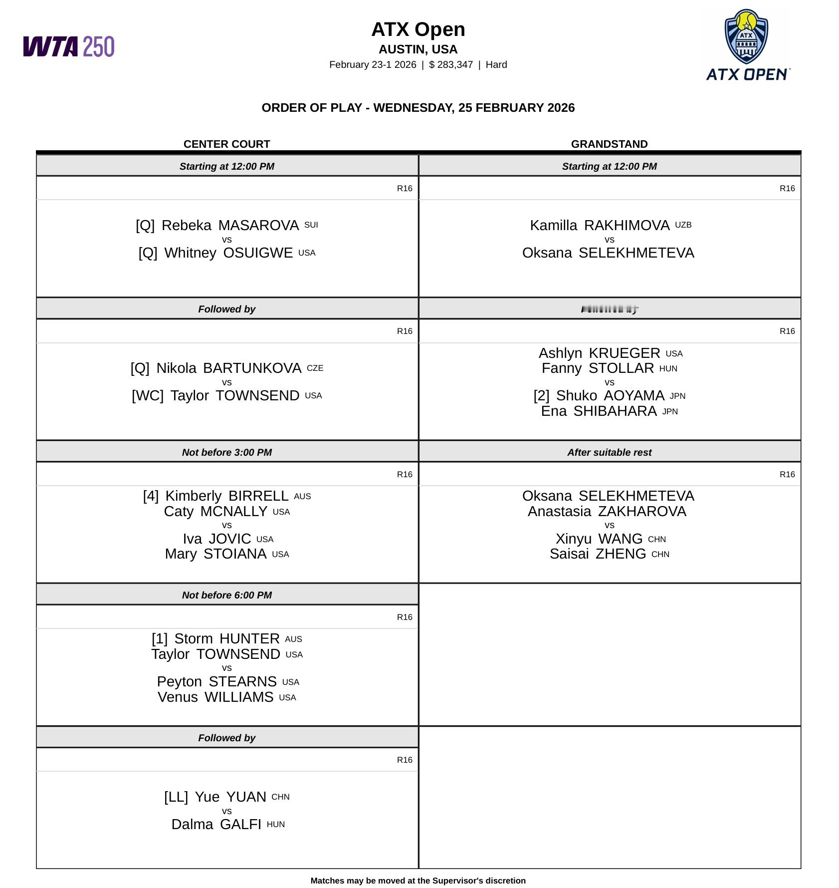 袁悦对阵加尔菲,大威廉姆斯出战双打。比赛将在北京时间2:00开打。