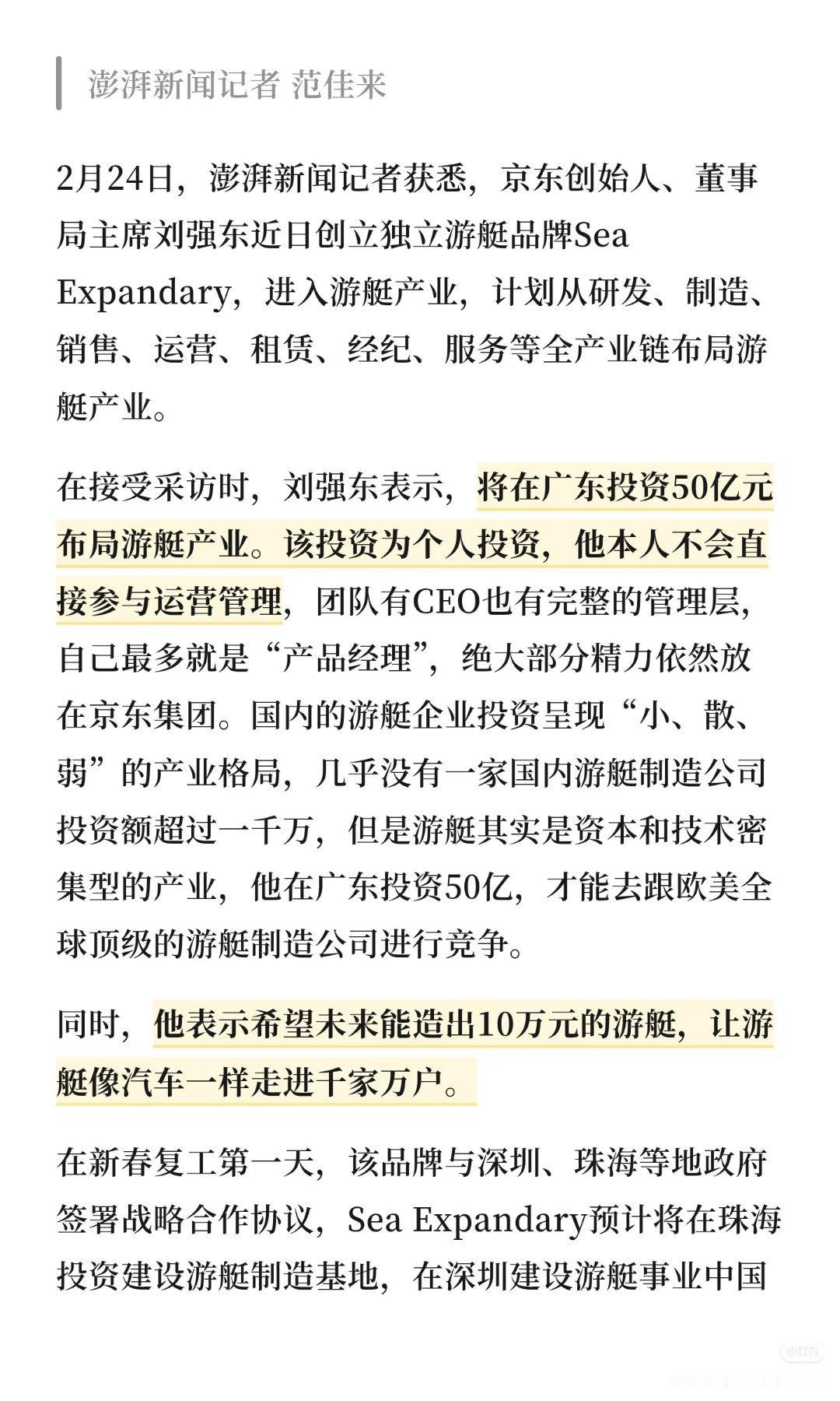 刘强东宣布进军游艇行业百分百新能源游艇,10万级别好游艇⛵,整挺好!