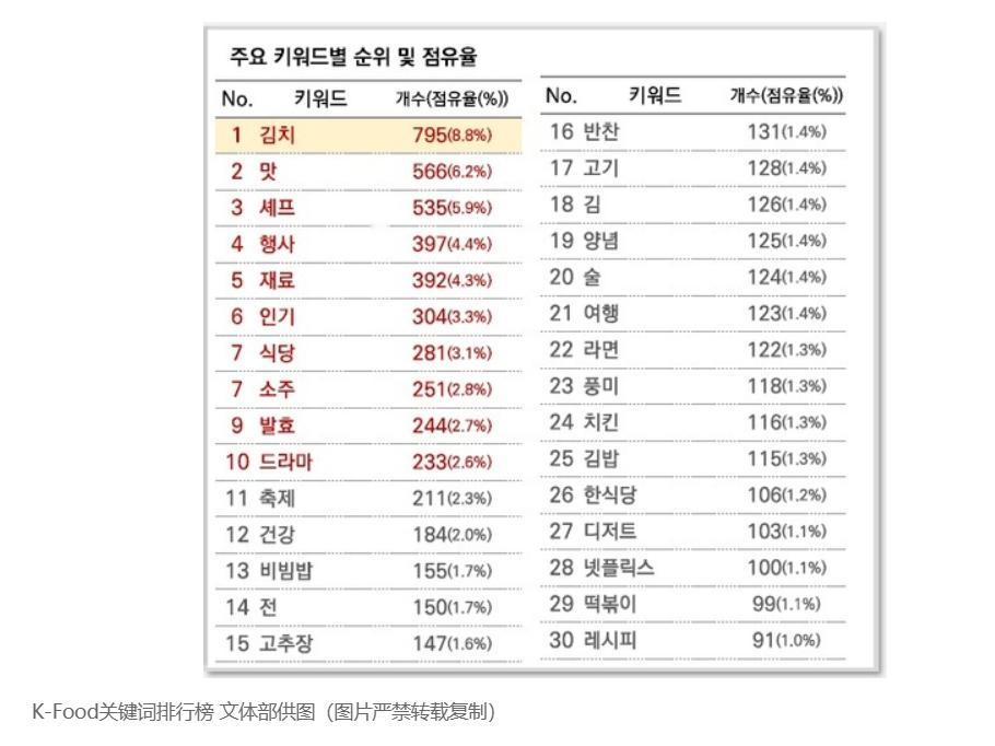 饮食文化方面,“辛奇(Kimchi,韩国泡菜)”“烧酒”“方便面”“拌饭”等传统美食和大众餐饮食品持续受到关注。此外,得益于爆款综艺《黑白厨师》和《鱿鱼游戏》中出现的韩餐,“厨师”和“鱿鱼游戏”成为新的“K-Food”关键词。
