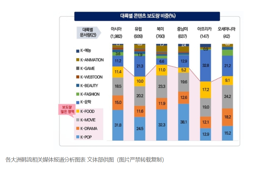 文化体育观光部和韩国文化信息院25日发布上述报告。据报告,对亚洲、欧洲、北美、中南美媒体有关韩流的报道进行分析的结果显示,K-POP相关报道占比最大,亚洲31.8%、欧洲24.5%、北美32.3%、中南美38.1%。话题性方面,BLACKPINK以14.2%的占比居首,防弹少年团(BTS,7.3%)和NewJeans(3%)也跻身前十。