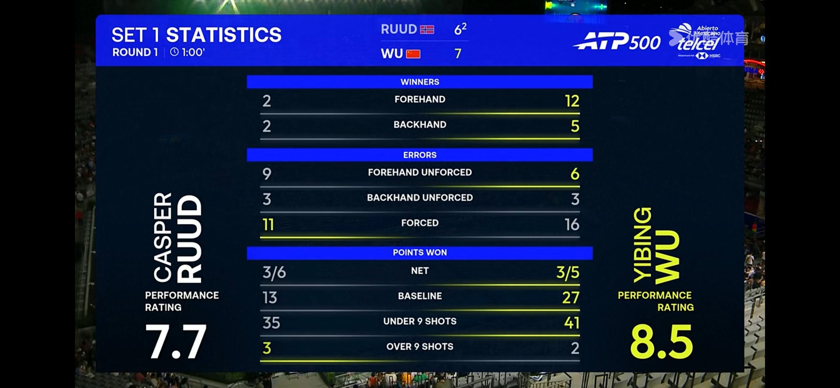 吴易昺在阿卡普尔科第一盘7-6鲁德。阿昺第一盘狂刷制胜球:正手12个;反手5个!