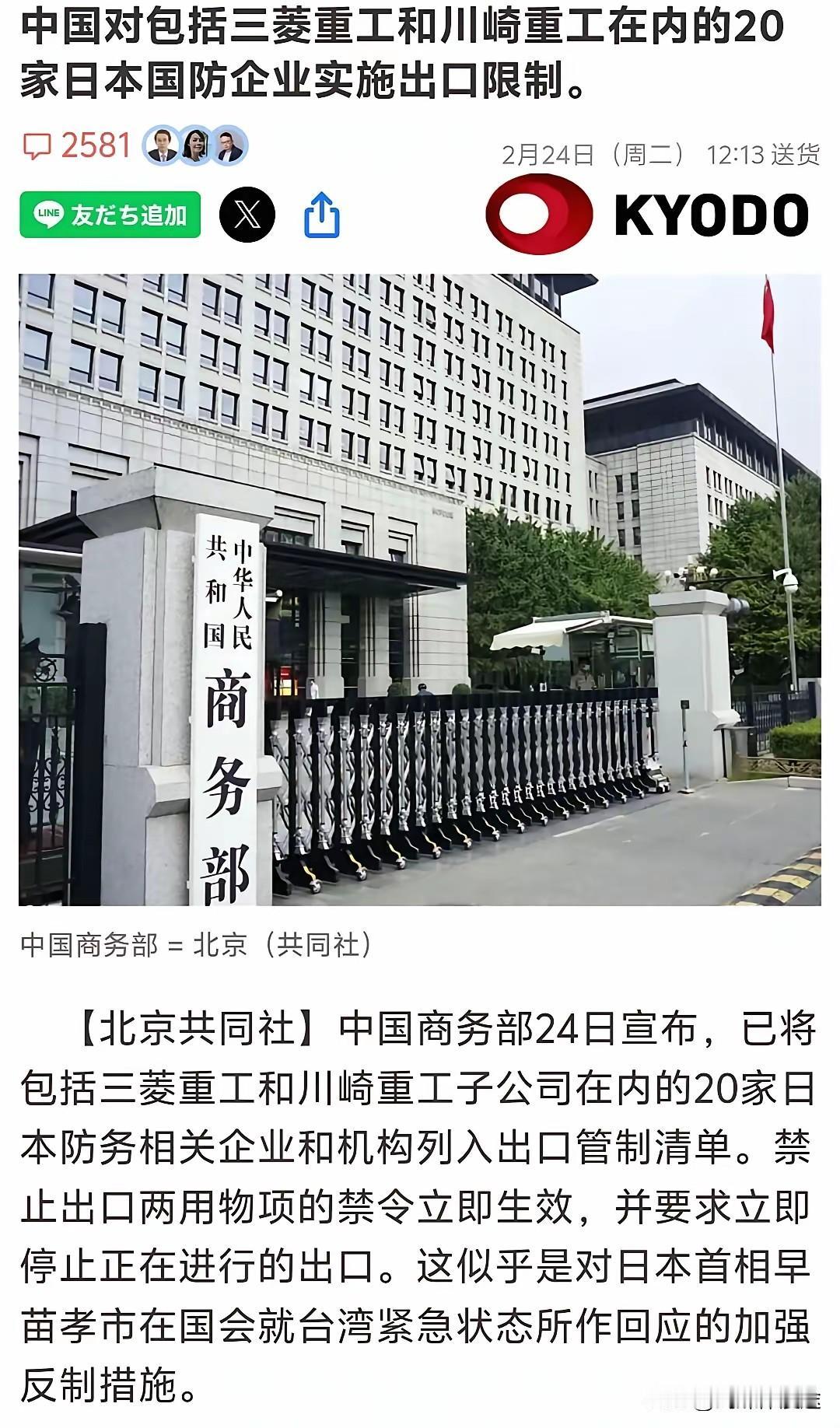 “打错算盘了”!高市本以为胜选等来“妥胁”,谁知等来了对日本 20 家企业的两用物项的全面禁止出口!这就是送给高市最好的“礼物”! 就在 2026 年 1 月份高市如“闪电般”的手段解散的日本众仪字,以豪赌“首相之位”为赌注,准备大干一场。而自民党内部讨论后表示,高市以这种方式 凭借日本右翼高支持率为依托,只要让自民党再次选举获胜,中国一定会知难而退,主动与日本搭上关系 和好。以此让中日关系得以恢复!如此一厢情愿的“梦想”也只有日本这样的民族才敢想 想得出来! 而事实呢: 农历新年复工第一天,商务部发布公告,对20家日本实体进行制裁,这些企业都涉嫌违反此前出台的两用物项出口管制。 《日本经济新闻》报道说,中国这次对日施压加码,日企坦言担忧供应链,因为“中国产零部件的采购不是少数,如果不能进口,影响很大”。 日媒评论说,中国将经济施压从旅游行业扩大到民生产品,要求日方让步的姿态没有改变”,还引用中国学者的话说,从中可以看出中国“无论如何也要迫使日本作出让步的强烈意志”。 中国这次“特别锁定”日本关键企业,不仅会重击日本关键产业,尤其是用中国稀土制造并用来出口和军事干涉中国统一的企业,对高市政权的震动会非常之大! 从中国的角度上来看,用两用物项的管制 是合情合理,同时也是对世界其它国家的一种警告,也希望其它国家在对待一个中国原则的国际共识的问题上,日本就是一个反面的教材! 这也体现了中国反强大的反击能力与意志,在一个中国原则上 中国的国家主权与领土不容侵犯,这是提醒也是警告。 反之日本执政当局 不思反醒 执迷不悟 而带来的后果 日本经济下滑必然是一个趋势!