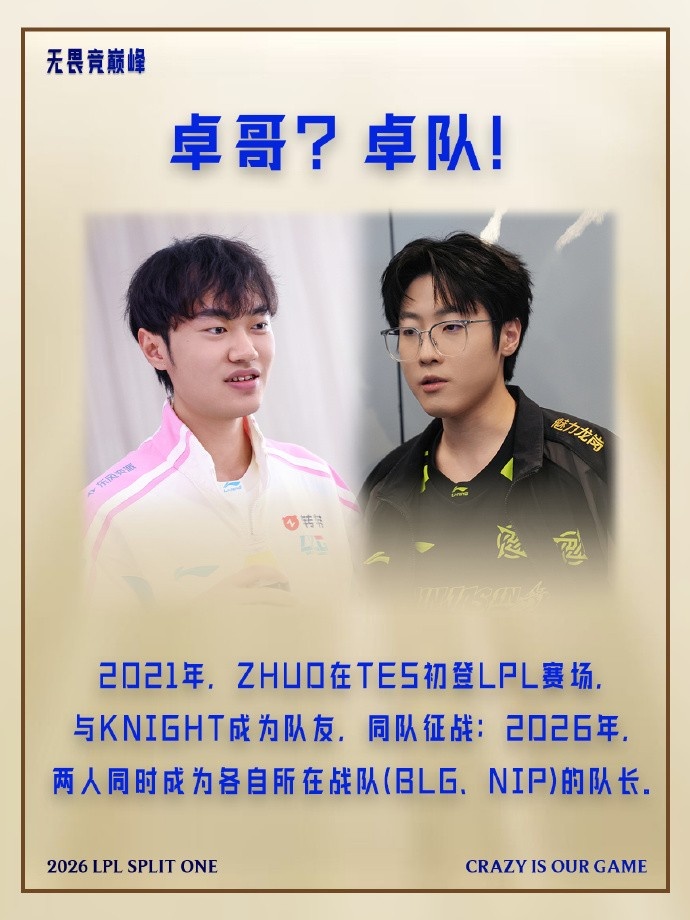 2021年,zhuo在TES初登LPL赛场,与Knight成为队友,同队征战;2026年,两人同时成为各自所在战队(BLG、NIP)的队长。