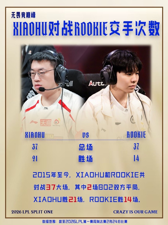 LPL趣味数据:xiaohu和Rookie共对战37场 Xiaohu胜21场 2场BO2平