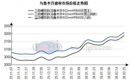 根据兰格钢铁云商平台监测数据显示,以乌鲁木齐为例,截至2026年2月28日,乌鲁木齐建材市场HRB400EΦ22mm螺纹钢八钢3210元,昆仑钢铁3190元,昆玉3190元,闽新3190元,大安3180元,新安特3180元,和钢3170元,较上个交易日持稳;HB300Φ8-10mm高线八钢3360元,较上个交易日持稳;HRB400EΦ8-10mm三级盘螺八钢3410元,较上个交易日持稳。