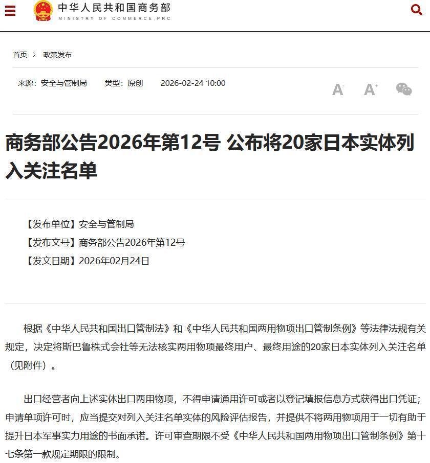 趁你病要你命! 日本经济陷入结构性危机: 中国制裁终于开始升级了。 说白了,日本经济早已深陷结构性危机,自顾不暇之际,中国终于出手升级制裁。春节假期后首个工作日,商务部就发布两条重磅公告,将20家日本实体列入出口管制名单,军民两用物项管控的另一只靴子正式落地,这不是趁人之危,是对日本频频挑衅的正当反击,纯属咎由自取。 其实,日本经济的危机早有迹可循。日元购买力创53年新低,经济增长停滞、通胀高企,去年企业破产数创近十年新高,九成是中小企业,加上美国近期加征15%关税的冲击,经济就像漏风的破船,一步步滑向深渊。 可问题在于,日本政府不思挽救经济,反倒一门心思跟着美国反华,频频在台海、南海挑衅,还纵容企业违规。要知道,日本压根没有民企和军工的差别,这些被管控的企业,早就暗中涉足军事领域,中国此前的警告,他们全当耳旁风。 然而,这次的制裁升级绝非隔靴搔痒。中国精准拿捏日本软肋,20家被管控实体涵盖电子、机械等核心领域,都是日本经济的命根子,两用物项出口被彻底叫停,相当于直接卡住其供应链喉咙。 不过,最让人解气的是,日本连反抗的力气都没有。此前外务省还敢跳脚抗议,如今经济危机叠加美国关税打击,企业界叫苦不迭,只能眼睁睁看着,毕竟自身理亏,再叫嚣也没用,典型的色厉内荏。 无独有偶,美国的关税政策更是雪上加霜。特朗普政府宣布对所有国家加征15%关税,日本企业界忧心忡忡,经济团体联合会和同友会纷纷表态担忧,却连半句抗议都不敢说,反倒指责中国的正当管制,欺软怕硬的嘴脸暴露无遗。 话说回来,这20家只是开始,这个管制名单未来只会扩大不会减少。日本要是识相,就该收敛挑衅,要是还执迷不悟,怕是只能赶紧去南鸟岛挖稀土凑数了,要不然,后续只会更被动,连挣扎的余地都没有。 说到底,中国制裁升级,看似“趁你病要你命”,实则是底气与实力的彰显。日本的困境全是自找的,既不反思自身挑衅,也不解决经济危机,反倒怨天尤人,再这样下去,别说挖稀土,怕是连经济基本盘都保不住,最终只能自食恶果。 以上是小编个人看法,如果您也认同,麻烦点赞支持!有更好的见解也欢迎在评论区留言,方便大家一同探讨。