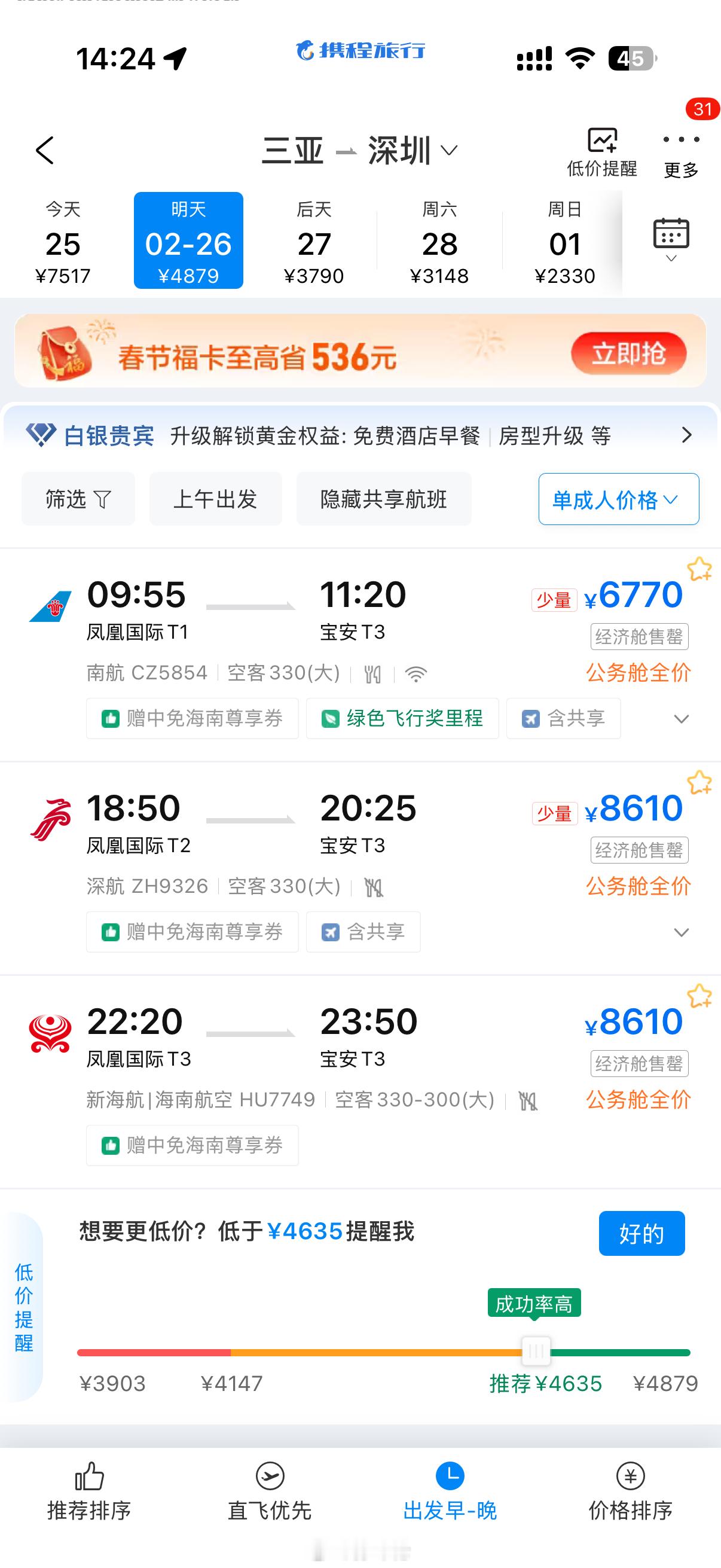 刚刚看了眼,三亚明天回深圳的机票竟然全部卖空了现在三亚出港的境外航班比国内便宜多了,可以最划算的话可以飞香港或者泰国,都能走得掉。