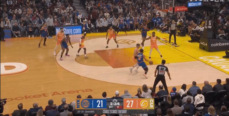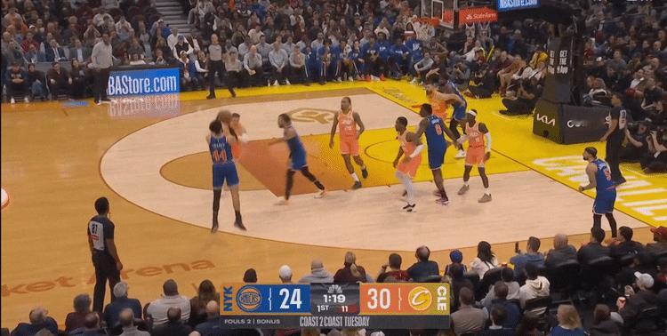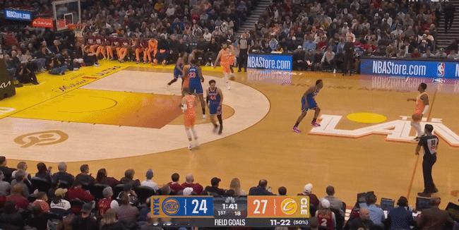 米-施-梅-泰-韦这套超级小阵容在全场6:28的上场时间内赢了6分,在场时把尼克斯进攻效率限制到了wcuba级别的41.7,即使刨除完全投不进球的下半场,只看第一节3:28秒尼克斯的进攻效率也只有62.5 %,骑士并没有在这个小阵容时间段中丢到多少前场篮板,反而能给通过调度米罗&布伦森轻松打穿尼克斯中路。