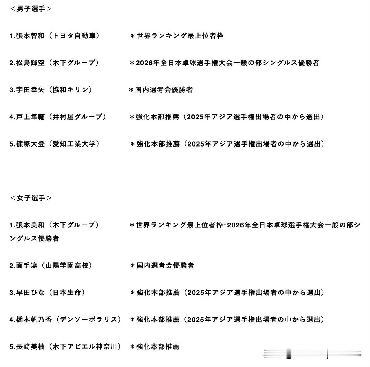 日本伦敦世乒赛名单,很明显要派桥本帆乃香捉各协会的三单,包括国乒在内, 并且长琦美柚取代了大藤莎月。 男团的名单在意料之中,遇到中国队的话,我们都不陌生,只是除了还有败绩的队员需要加油了。 女团有一些意外,桥本帆乃香入选,是来扫各协会的三单的,国乒也不例外, 国乒能打赢桥本的半只手都数过来了, 所以,今天新加坡的比赛陈熠对上桥本,一定要赢啊,赢一次,就有底气了。 长崎美柚代替了大藤莎月,大概亚洲杯她战胜王艺迪,也有加分,最近确实也冲的比较猛。 针对日本队的名单,国乒的人选也基本出来了。坐等公布。