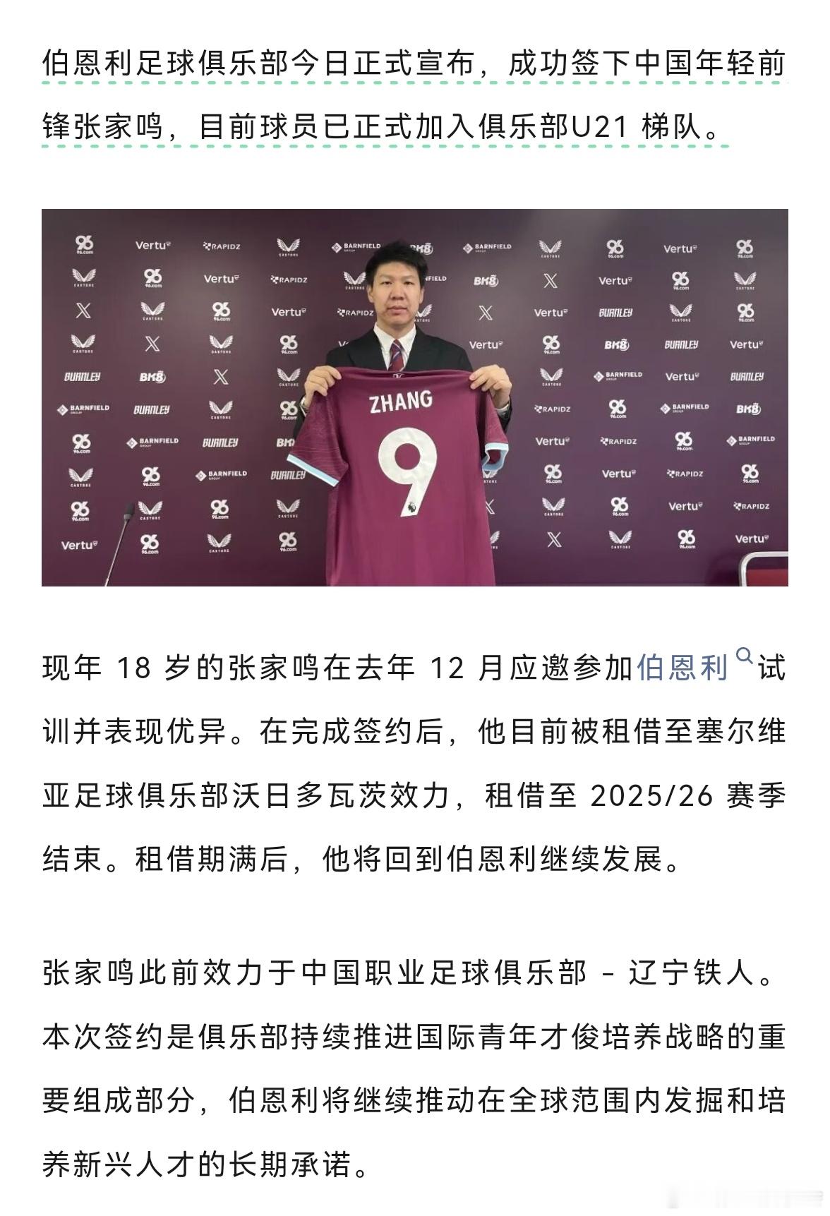 英超伯恩利俱乐部签下辽宁籍球员张家鸣,真开心,我大侄子一转眼也留洋了! 张家鸣目