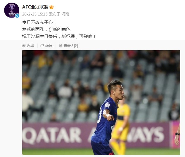 亚冠联赛官博发文表示:“岁月不改赤子心!熟悉的面孔,崭新的角色。祝于汉超生日快乐,新征程,再登峰!”